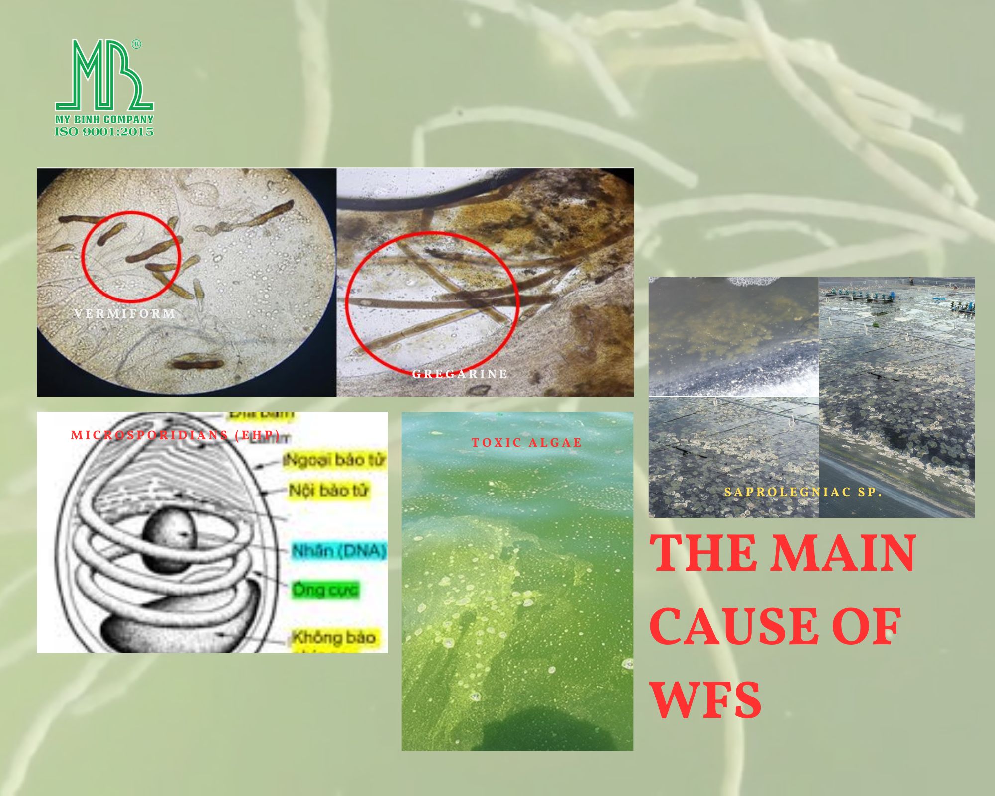 White Feces Syndrome is characterized by the presence of white, floating fecal strings in shrimp ponds. The main causes include:
