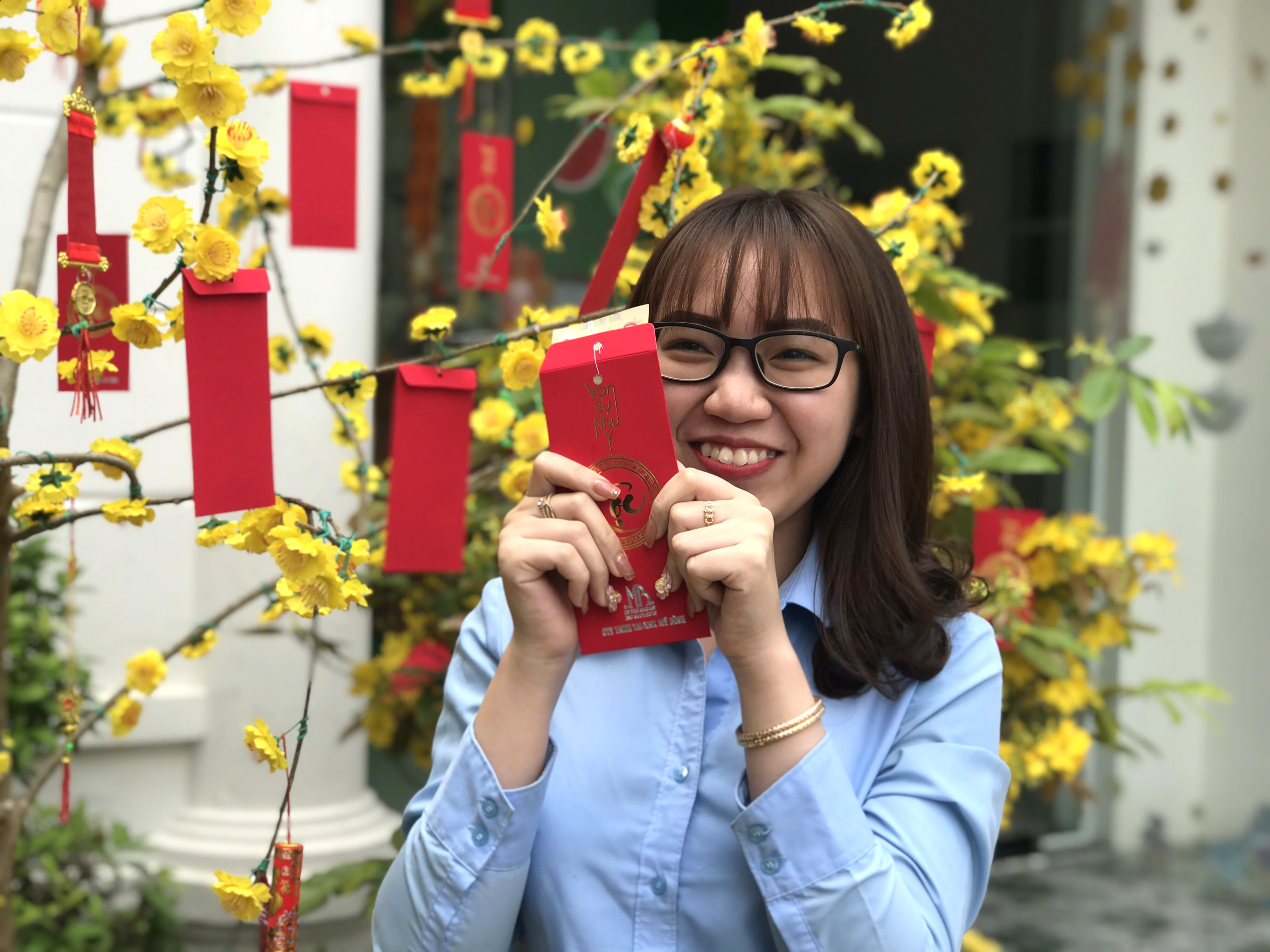 Những bao lì xì đỏ thắm gửi gắm những may mắn của Mỹ Bình trao gửi đến nhân viên công ty