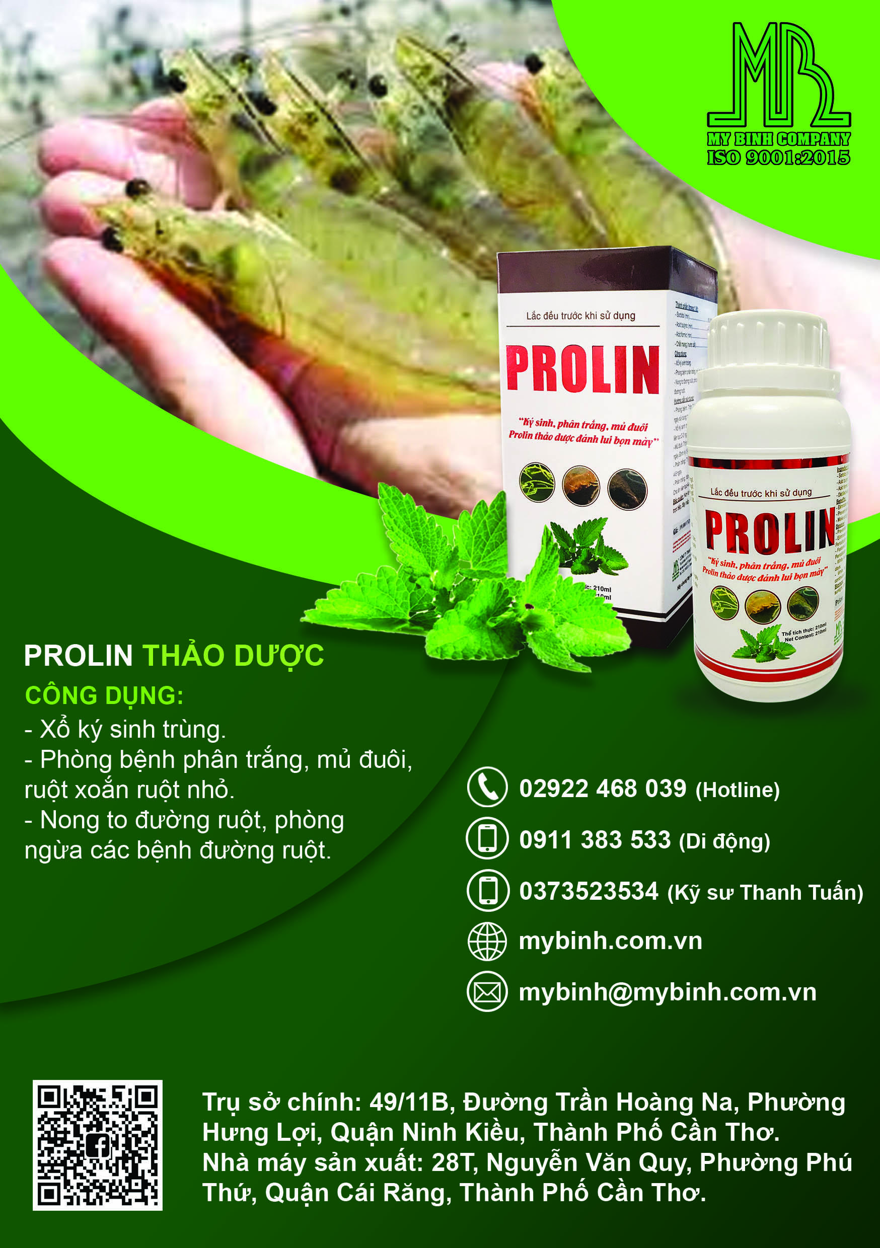 Tháng 05 vừa qua Mỹ Bình đã có sự đột phá nổi bật với sự xuất hiện của sản phẩm PROLIN, một sản phẩm được chiếc suất từ thảo dược có công dụng đặc trị ký sinh, phân trắng, mủ đuôi cho tôm.