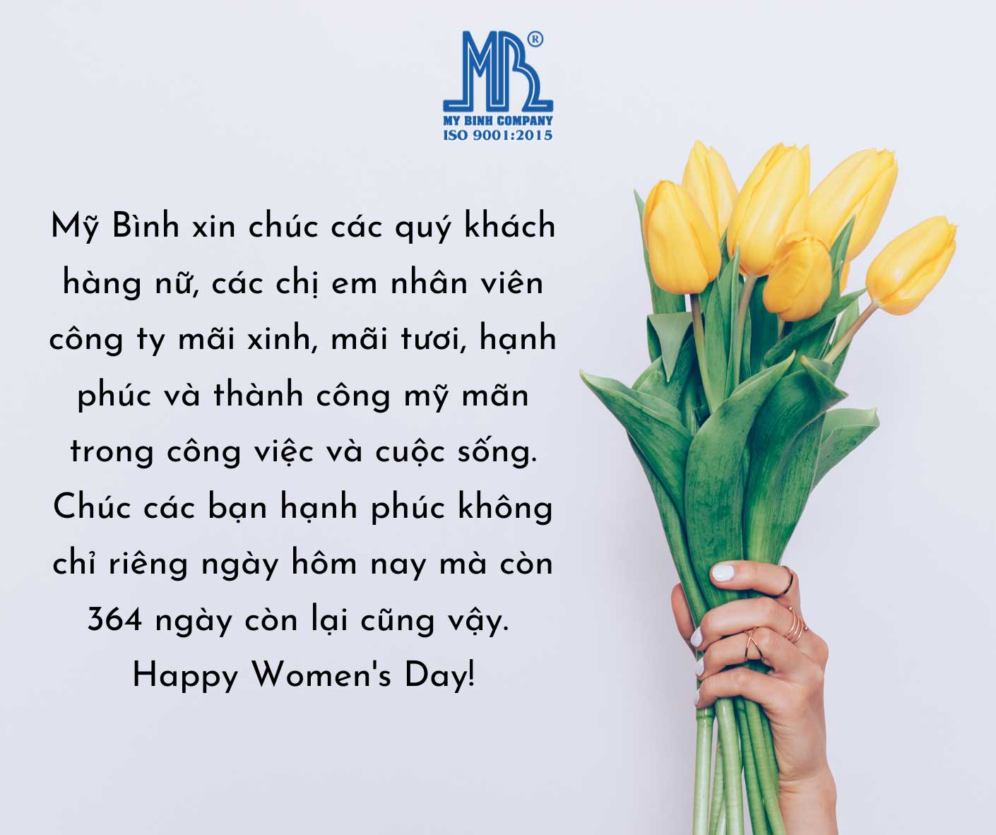 Mỹ Bình xin gửi lời chúc đến quý khách hàng nữ và các chị em nhân viên công ty một 8/3 vui vẻ, hạnh phúc.