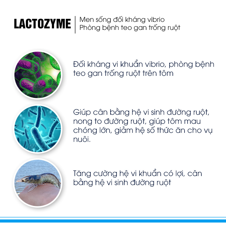 Giải pháp đột phá đối phó với bệnh teo gan trống ruột LACTOZYME, là một giải pháp sử dụng men sống để thay thế kháng sinh và hóa chất diệt khuẩn. LACTOZYME chứa hàng tỉ lợi khuẩn Bacillus spp giúp ngăn chặn sự tấn công của các vi khuẩn Vibrio gây ra các bệnh teo gan trống ruột, phân lỏng, phân đứt khúc, phân trắng. Đồng thời tăng cường hệ vi sinh có lợi, giúp phục hồi và cân bằng hệ vi sinh đường ruột, nong to đường ruột, giúp tôm ăn nhiều mau lớn, giảm hệ số thức ăn cho vụ nuôi.