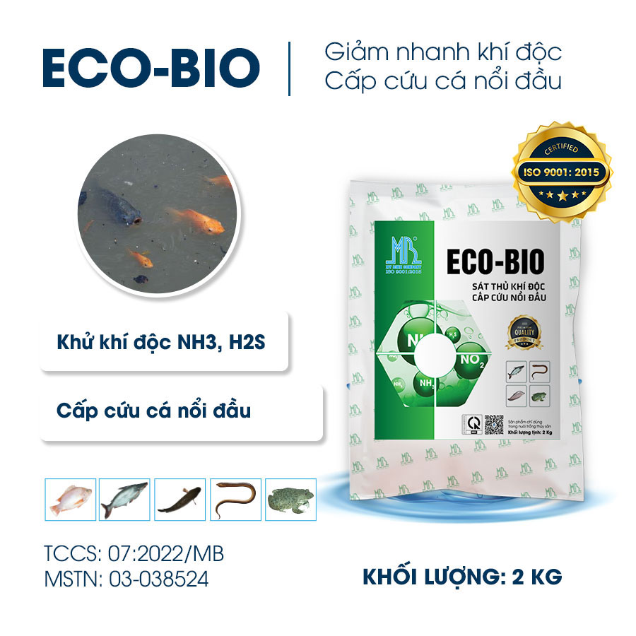 ECO BIO được sản xuất bởi công ty Mỹ Bình với thành phần được chiết xuất từ Saponin, và các khoáng chất cần thiết đã được chứng minh hiệu quả trong những trường hợp ao nuôi xuất hiện khí độc, giúp chống sốc, cấp cứu cá nổi đầu, lờ đờ, tấp mé. Khử độc nước ao, giảm nhanh khí độc NO2, NH3, H2S. Làm trong và sạch nước rất nhanh. Bổ sung khoáng chất giúp cá cứng chắc, giảm stress.