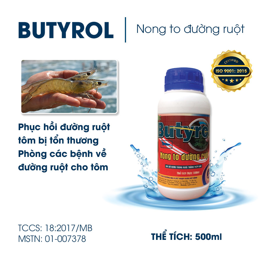 - Ngăn ngừa bệnh đường ruột cho tôm: trộn 3- 5ml BUTYROL/kg thức ăn. Cho ăn 2-3 lần/ngày.