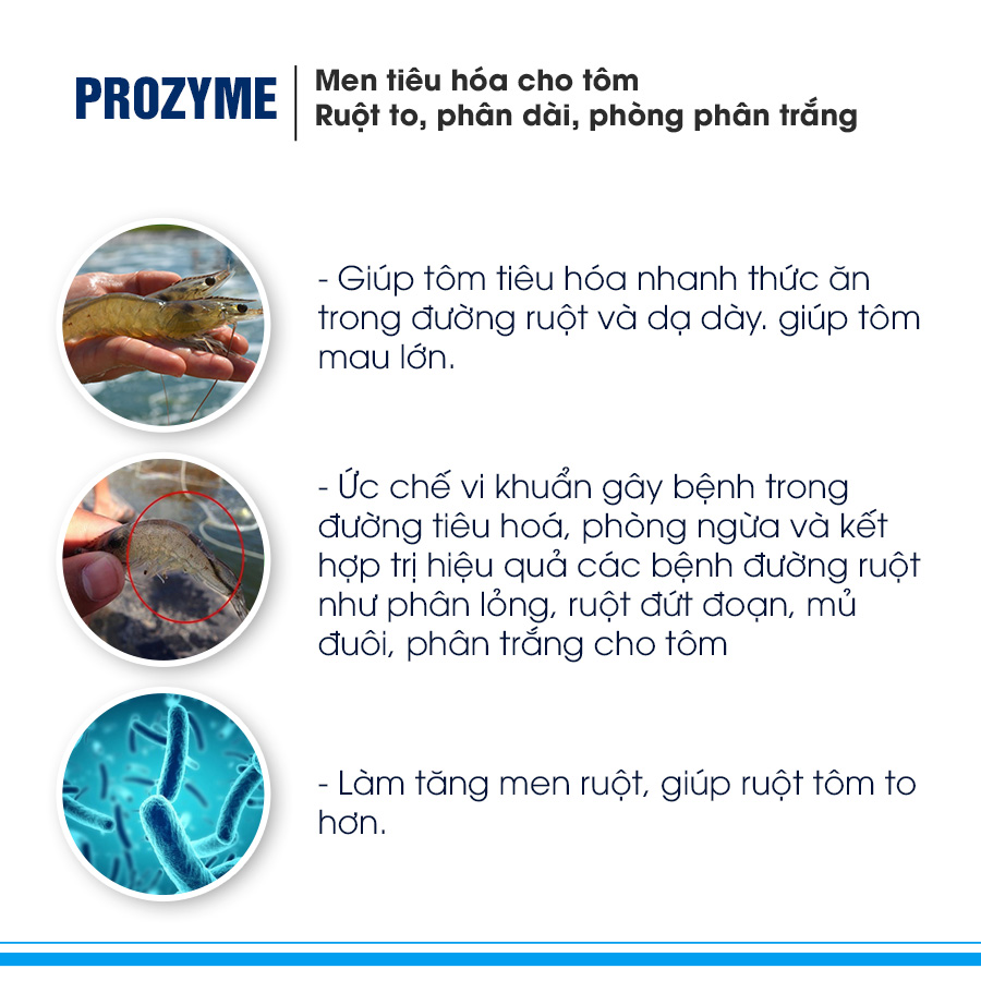 PROZYME giúp bổ sung men tiêu hóa có lợi với hàm lượng cao vào đường ruột tôm, giúp tôm tiêu hóa tốt, phòng ngừa các bệnh về đường ruột trên tôm hiệu quả.