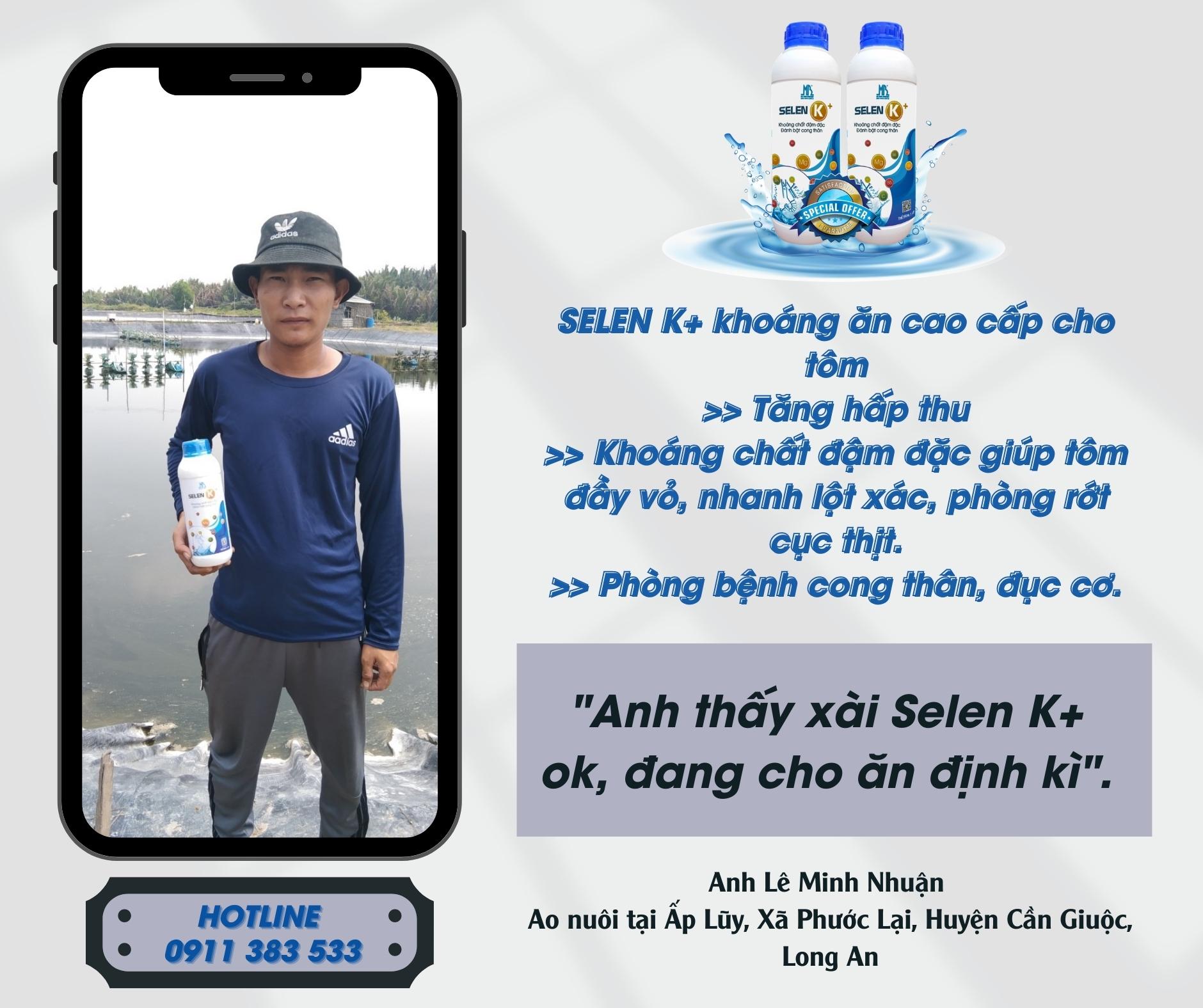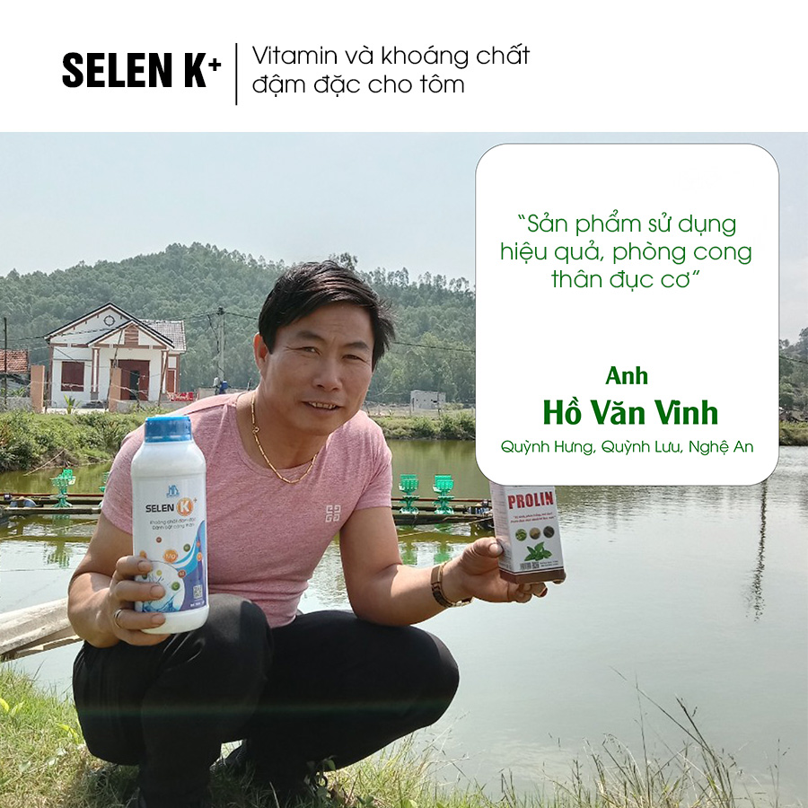 SELEN K+, là sự kết hợp độc đáo của các loại khoáng chất đa vi lượng và những vitamin thiết yếu nhằm giúp cho tôm tăng hấp thu tối đa và sinh trưởng, phát triển tốt. Selen K+ khắc phục tình trạng tôm nuôi bị mềm vỏ, mỏng vỏ, lột xác không cứng vỏ, rớt cục thịt trong quá trình nuôi. Đặc biệt SELEN K+ giúp hỗ trợ tốt trong việc phòng trị bệnh cong thân đục cơ trên tôm, cải thiện khoáng ở những vùng nuôi tôm có độ mặn thấp. Giúp giảm hao hụt khi sang ao cho các mô hình nuôi nhiều giai đoạn.