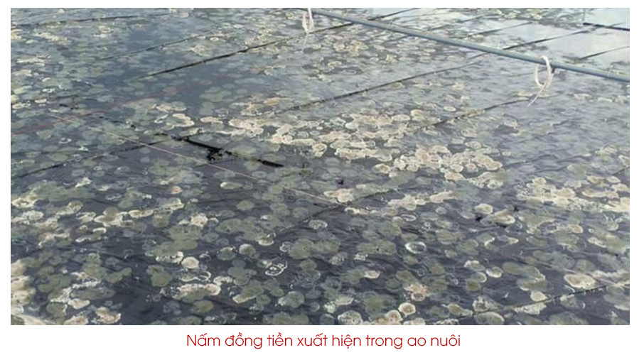 - Nấm đồng tiền xuất hiện trong ao nuôi.