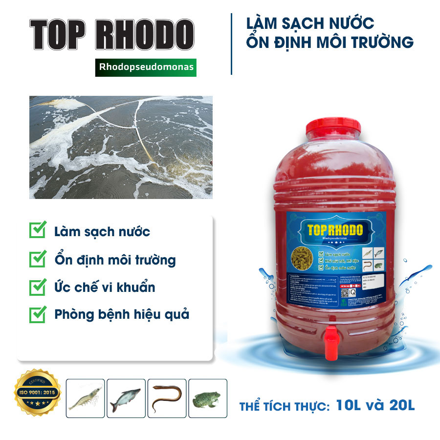TOP RHODO – sản phẩm men vi sinh thế hệ mới, chứa chủng Rhodopseudomonas mạnh nhất hiện nay, có khả năng vừa xử lý nước ao, vừa phòng trị bệnh đường ruột hiệu quả cao cho vật nuôi.