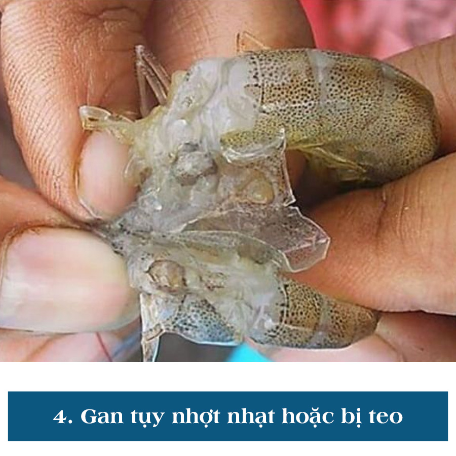 Kích thước: Khối gan tụy có dấu hiệu teo nhỏ, không còn đầy đặn như tôm khỏe mạnh.