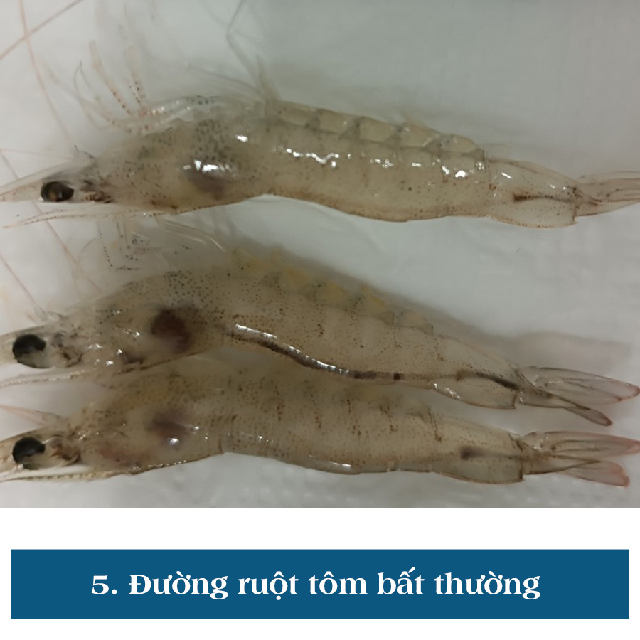Biểu hiện: Đường ruột tôm nhỏ, mờ nhạt, thường xuyên bị đứt đoạn hoặc trống thức ăn dù tôm vẫn bắt mồi.