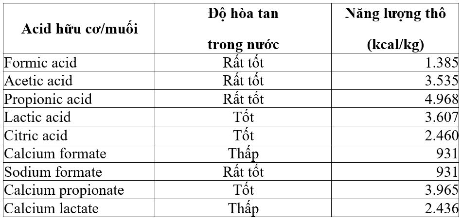 Bảng 2. Năng lượng thô của các acid hữu cơ và muối của chúng trong thức ăn dùng trong nuôi trồng thủy sản.