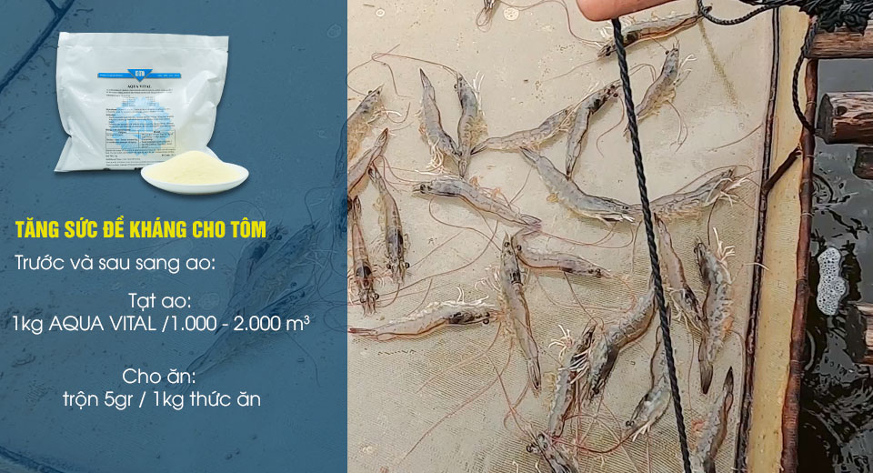 Ngoài ra, bà con có thể phát huy công dụng sản phẩm, tăng sức đề kháng vượt trội cho tôm nuôi bằng cách trộn vào thức ăn 5gr AQUA VITAL/ 1kg thức ăn.