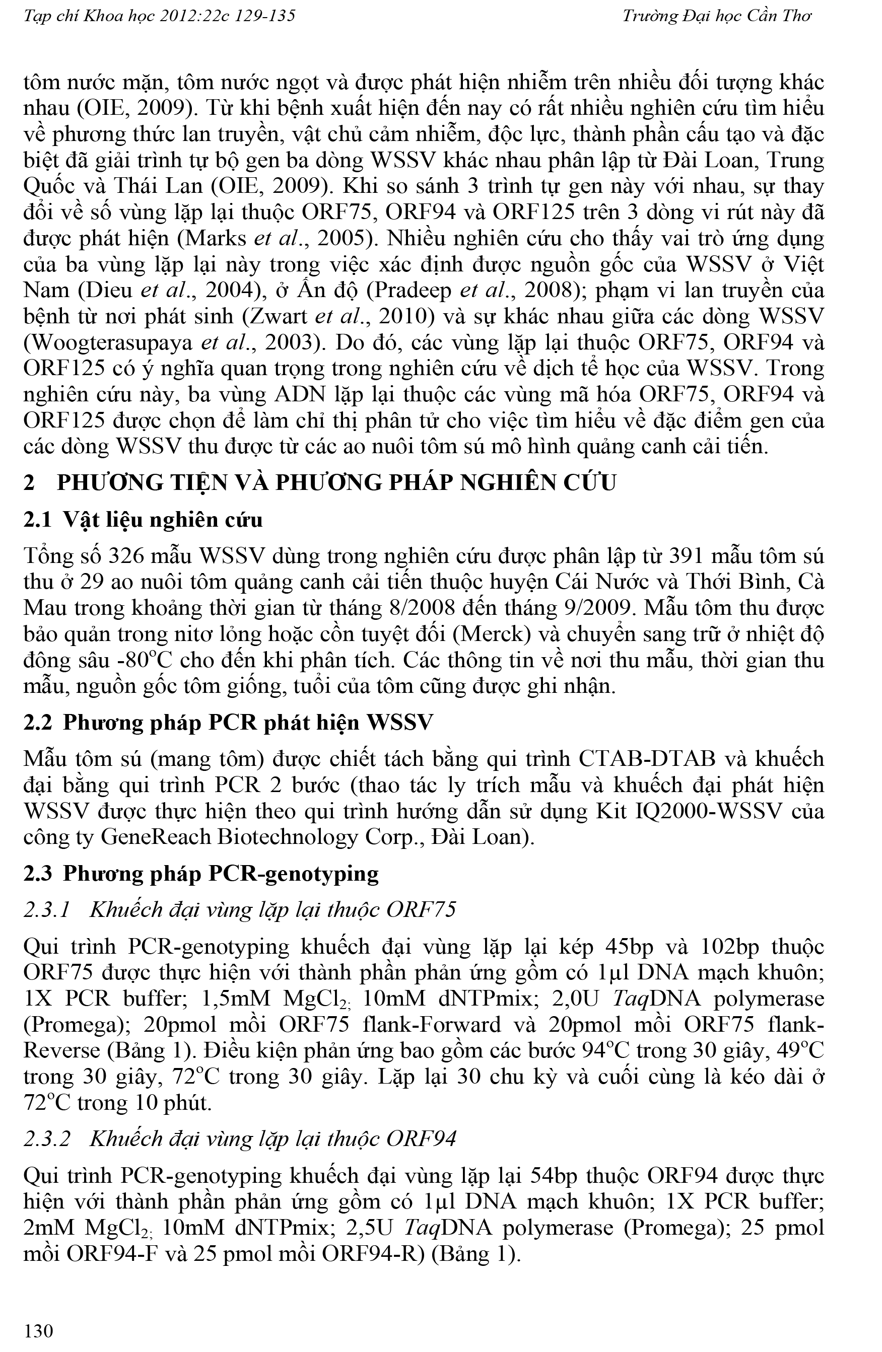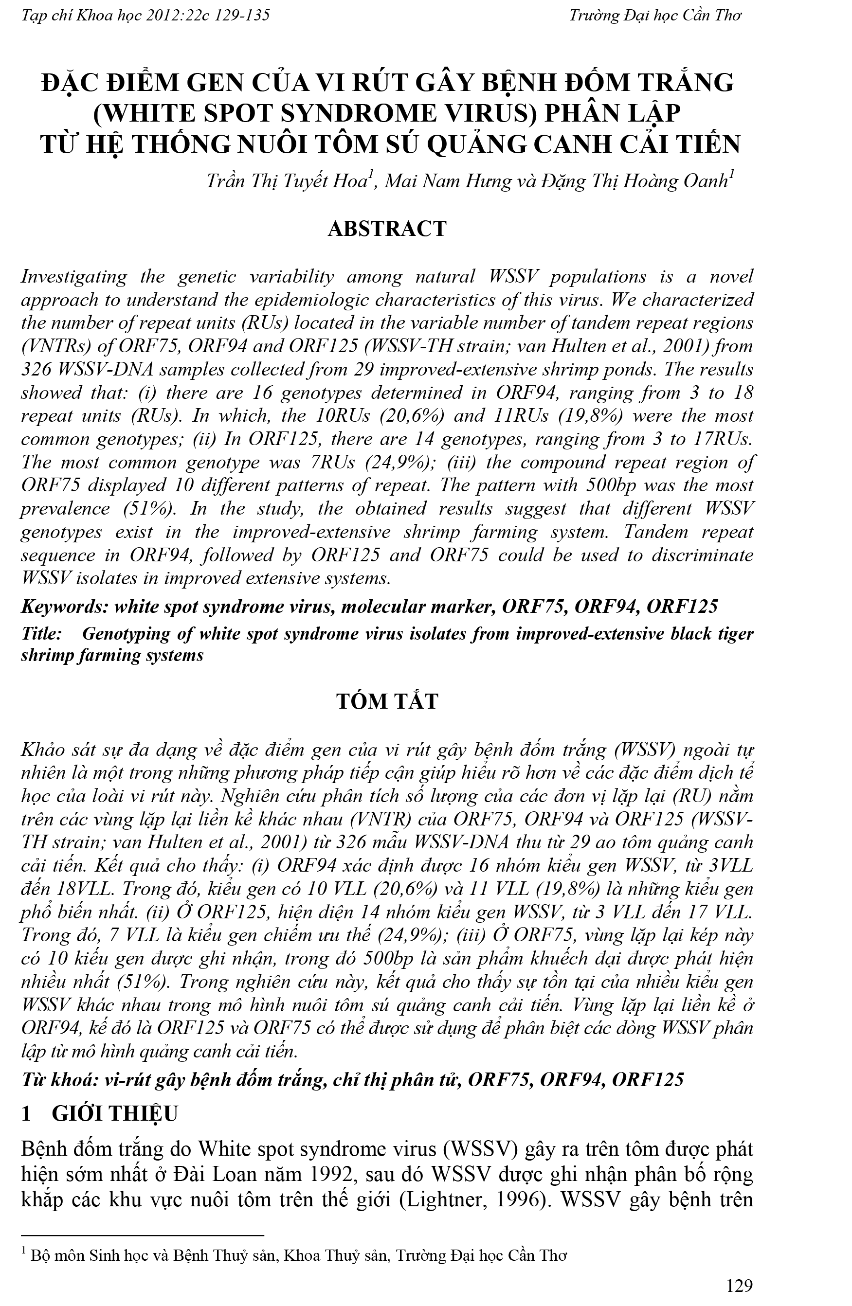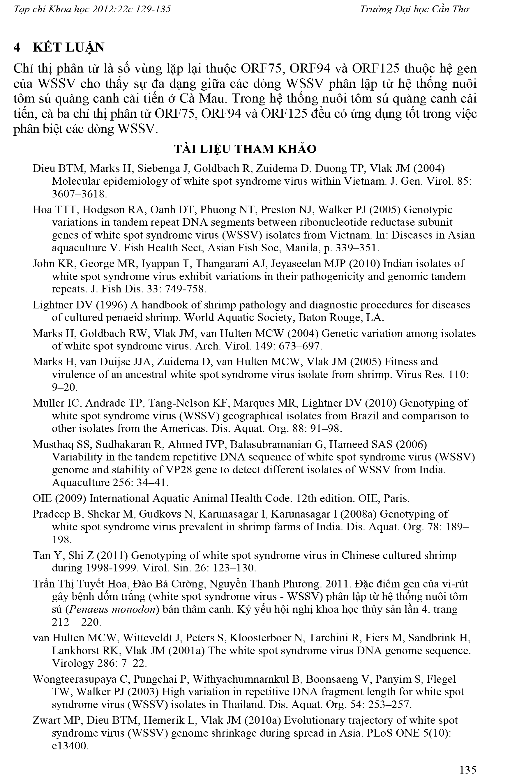 Đặc điểm gen của vi rút gây bệnh đốm trắng (White spot syndrome virus) phân lập từ hệ thống nuôi tôm sú quảng canh cải tiến