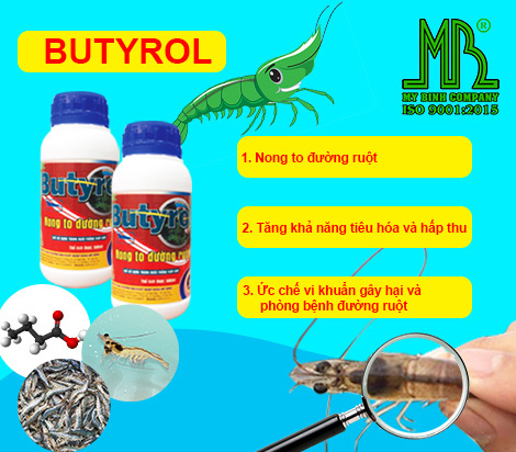 BUTYROL, là sản phẩm được tạo nên từ acid butyric (một dạng acid hữu cơ rất tốt) cùng các tá dược có tác dụng giúp cải thiện sức khỏe đường ruột tôm, thúc đẩy tăng sinh và biệt hóa tế bào biểu mô. Bài tiết enyzym và ổn định hệ vi khuẩn đường ruột của tôm, giúp tiêu hóa chất dinh dưỡng hiệu quả hơn, tăng cường khả năng ngăn chặn vi khuẩn có hại và dịch bệnh tốt hơn. Nhờ đó, hiệu suất tăng trưởng được cải thiện.