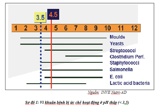 Trong đường ruột tôm tồn tại các nhóm vi khuẩn có ích và vi khuẩn bệnh, số lượng các nhóm này được duy trì ở trạng thái cân bằng (eubiosis). Do những nguyên nhân nào đó, số lượng vi khuẩn bệnh tăng lên, trạng thái cân bằng bị phá vỡ (dysbiosis), con vật bị rối loạn tiêu hóa và mắc bệnh. Nhóm vi khuẩn có ích thường là những vi khuẩn lên men sinh acid lactic như Lactobacillus, Bifidobacterium, Streptococcus…. Nhóm vi khuẩn bệnh thường là E.coli, Samonella, Clostridium perfringens, Staphilococcus aurius…Vi khuẩn có ích sống trong môi trường pH thấp hơn vi khuẩn bệnh. Ví dụ: pH thích hợp cho nhóm vi khuẩn lên men sinh acid lactic là 2 – 3, còn pH cho vi khu ẩn bệnh như E.coli là ≥ 4; Samonella là ≥ 3,5; Cl. perfringens là ≥ 6 (sơ đồ 1). Như vậy bổ sung acid hữu cơ để đưa pH dịch tiêu hóa xuống < 3,5 thì sẽ ức chế những vi khuẩn bệnh và tạo điều kiện cho vi khuẩn có ích hoạt động (Trích tạp chí KHKT Thức ăn Chăn nuôi số 6, 2008 (29) – Hiệp hội TACNVN).