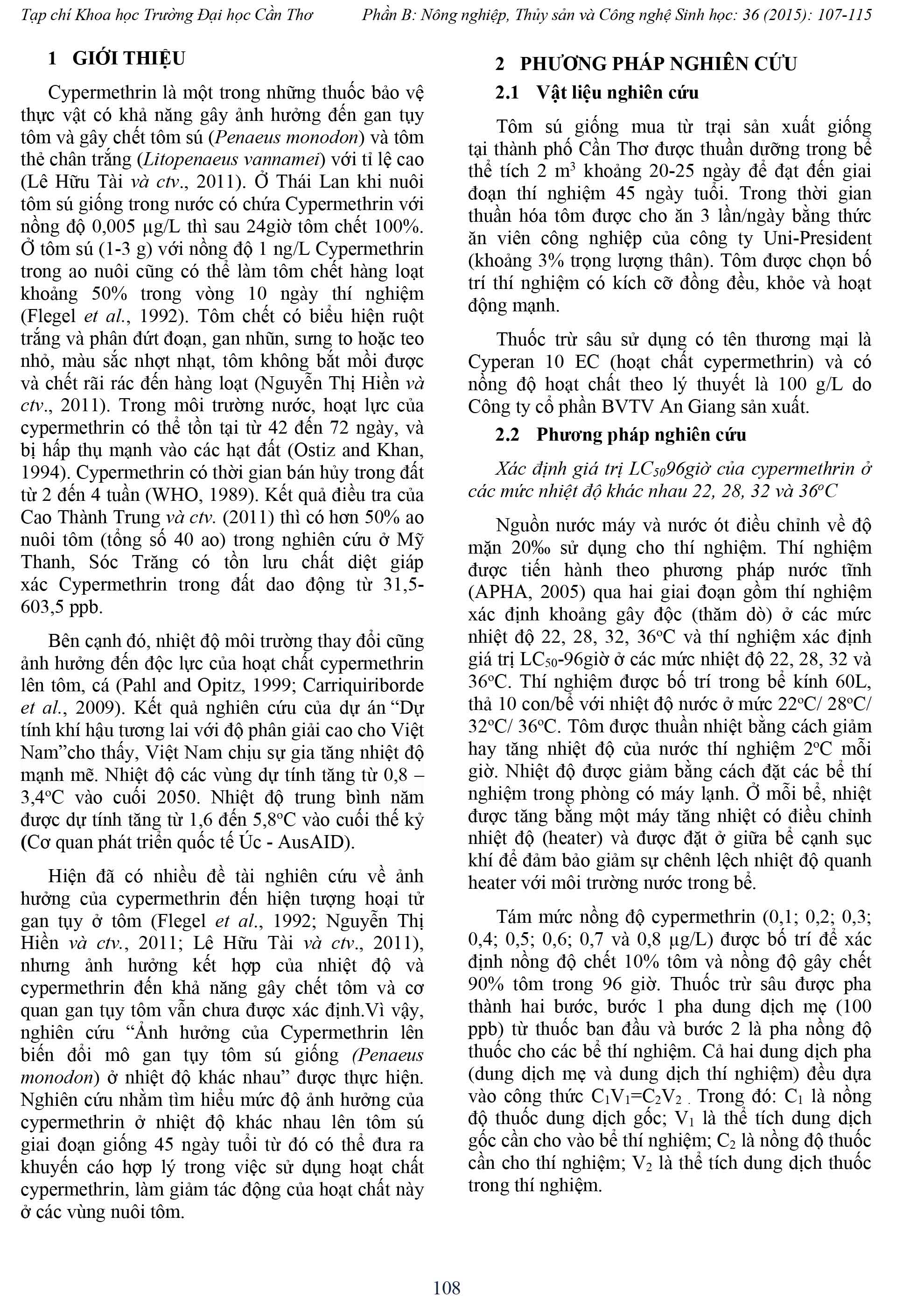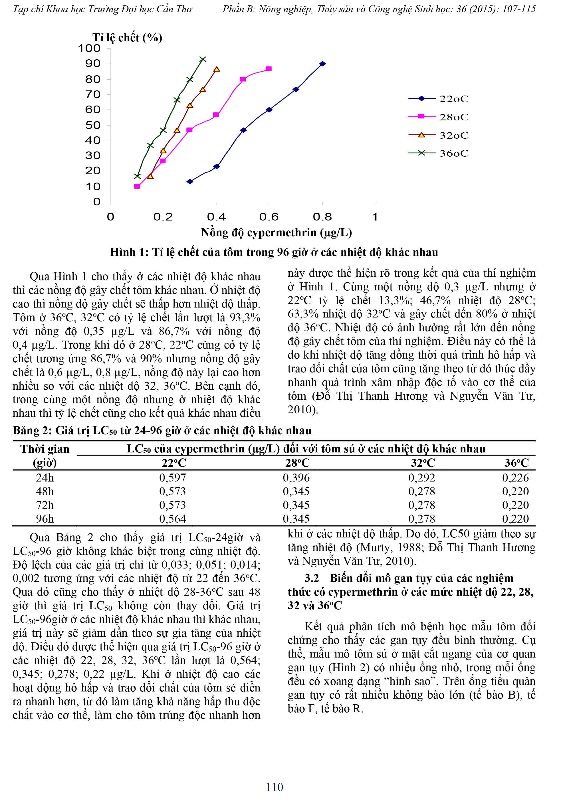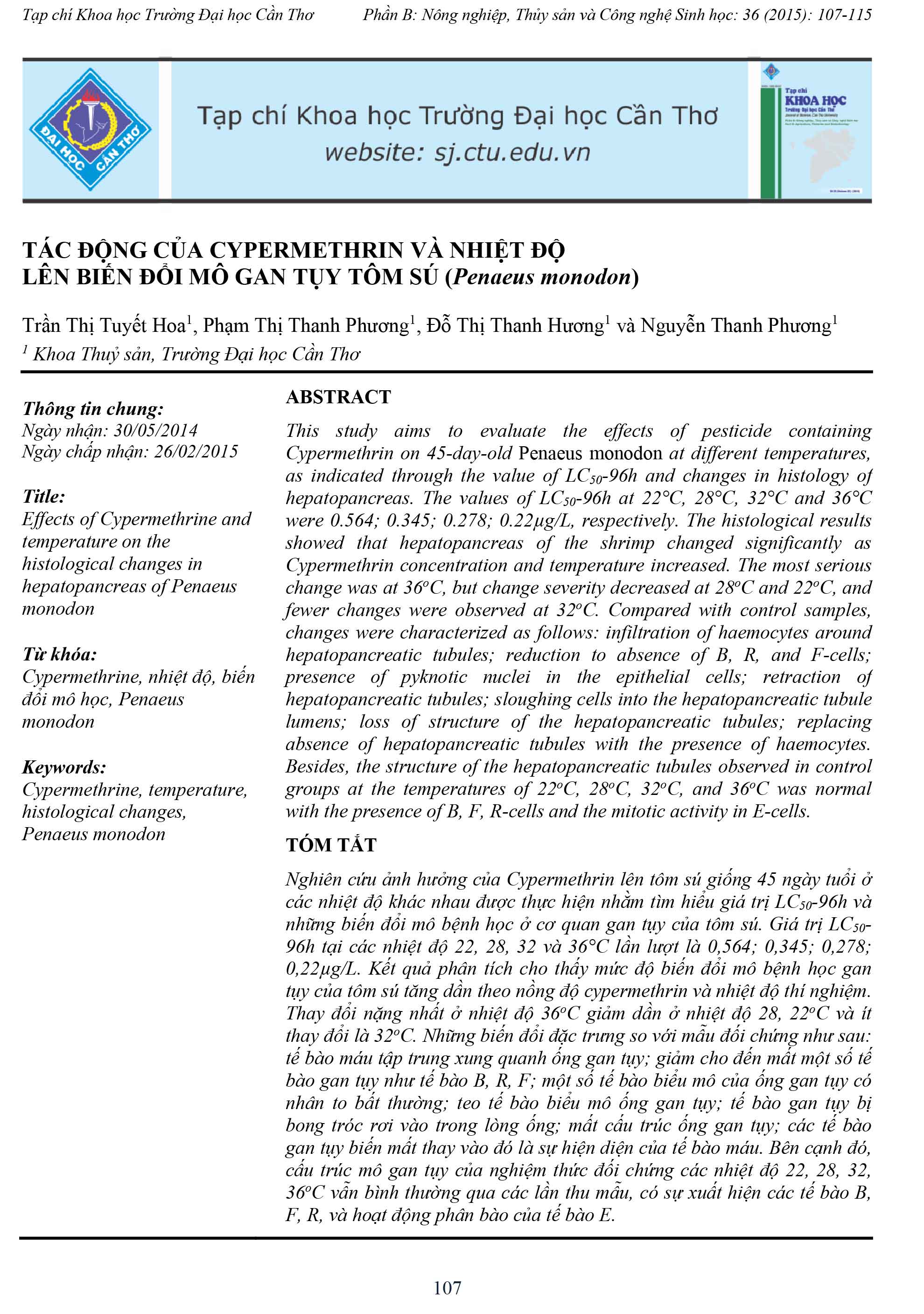 Nghiên cứu ảnh hưởng của Cypermethrin lên tôm sú giống 45 ngày tuổi ở các nhiệt độ khác nhau được thực hiện nhằm tìm hiểu giá trị LC50-96h và những biến đổi mô bệnh học ở cơ quan gan tụy của tôm sú. Giá trị LC50- 96h tại các nhiệt độ 22, 28, 32 và 36°C lần lượt là 0,564; 0,345; 0,278; 0,22µg/L. Kết quả phân tích cho thấy mức độ biến đổi mô bệnh học gan tụy của tôm sú tăng dần theo nồng độ cypermethrin và nhiệt độ thí nghiệm.