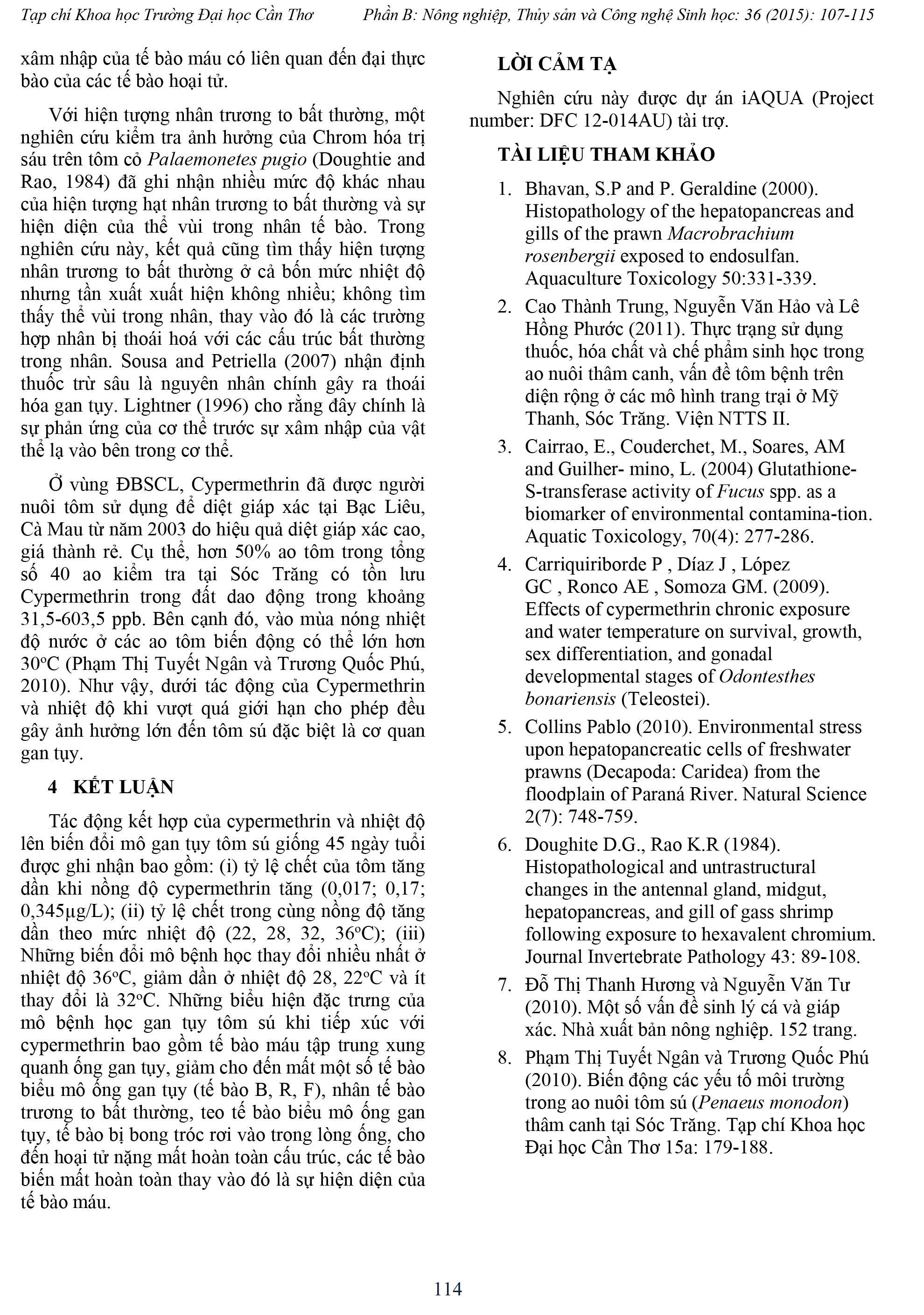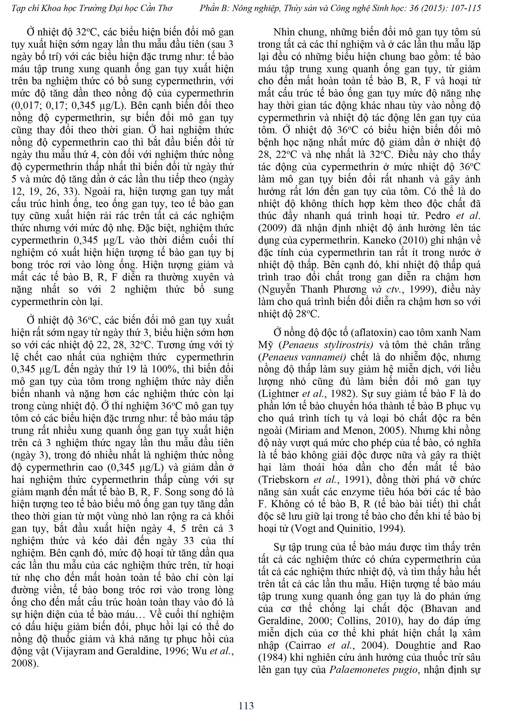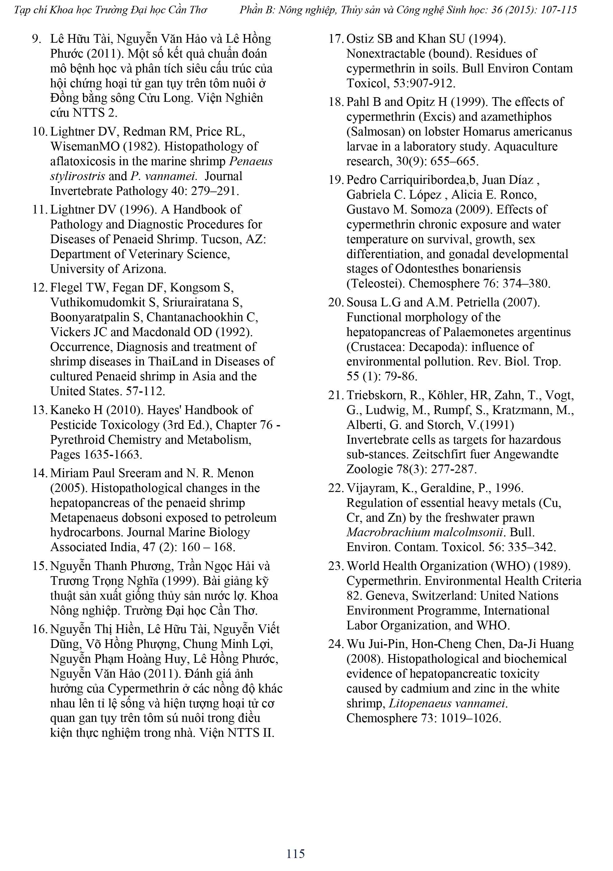 Nghiên cứu ảnh hưởng của Cypermethrin lên tôm sú giống 45 ngày tuổi ở các nhiệt độ khác nhau được thực hiện nhằm tìm hiểu giá trị LC50-96h và những biến đổi mô bệnh học ở cơ quan gan tụy của tôm sú. Giá trị LC50- 96h tại các nhiệt độ 22, 28, 32 và 36°C lần lượt là 0,564; 0,345; 0,278; 0,22µg/L. Kết quả phân tích cho thấy mức độ biến đổi mô bệnh học gan tụy của tôm sú tăng dần theo nồng độ cypermethrin và nhiệt độ thí nghiệm.