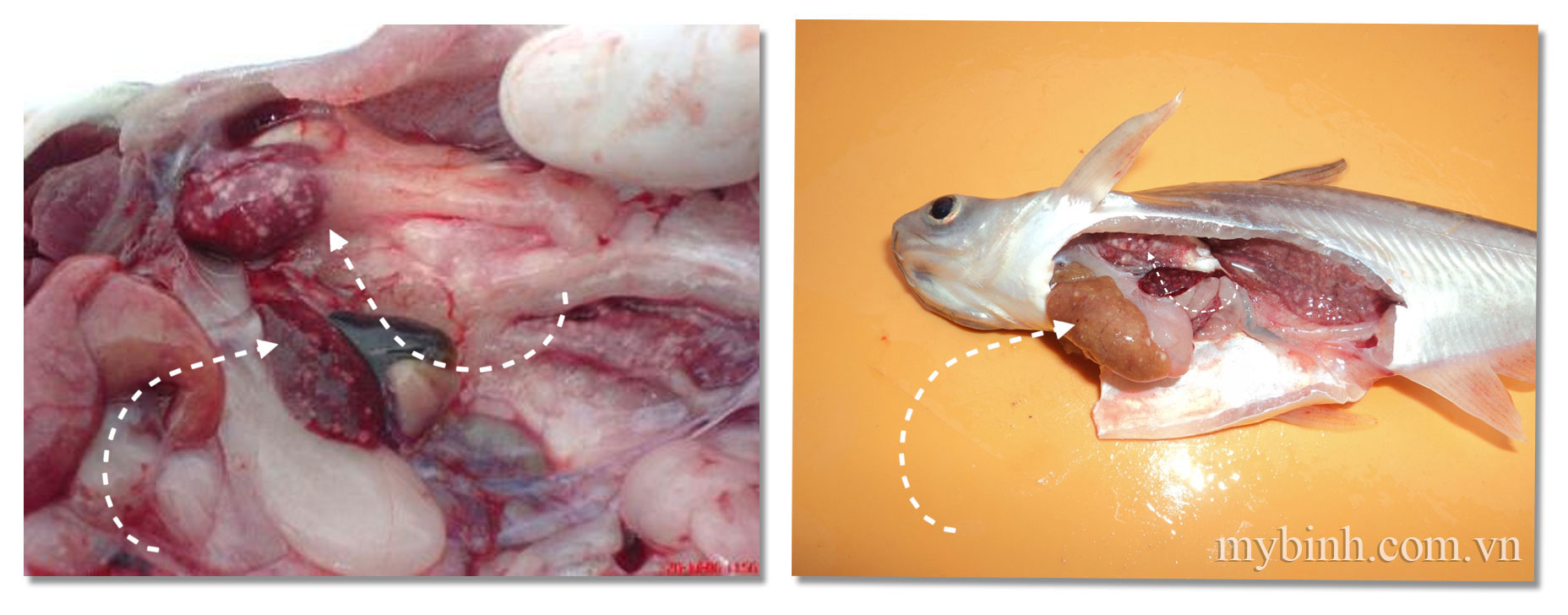 - Dấu hiệu bệnh lý bên trong: Xuất hiện nhiều đốm trắng đục kích cỡ từ 1-3 mm trên gan, thận và tụy tạng. Đặc biệt, ở giai đoạn đầu của bệnh, những đốm trắng này chỉ xuất hiện ở thận và kế tiếp là tụy tạng.