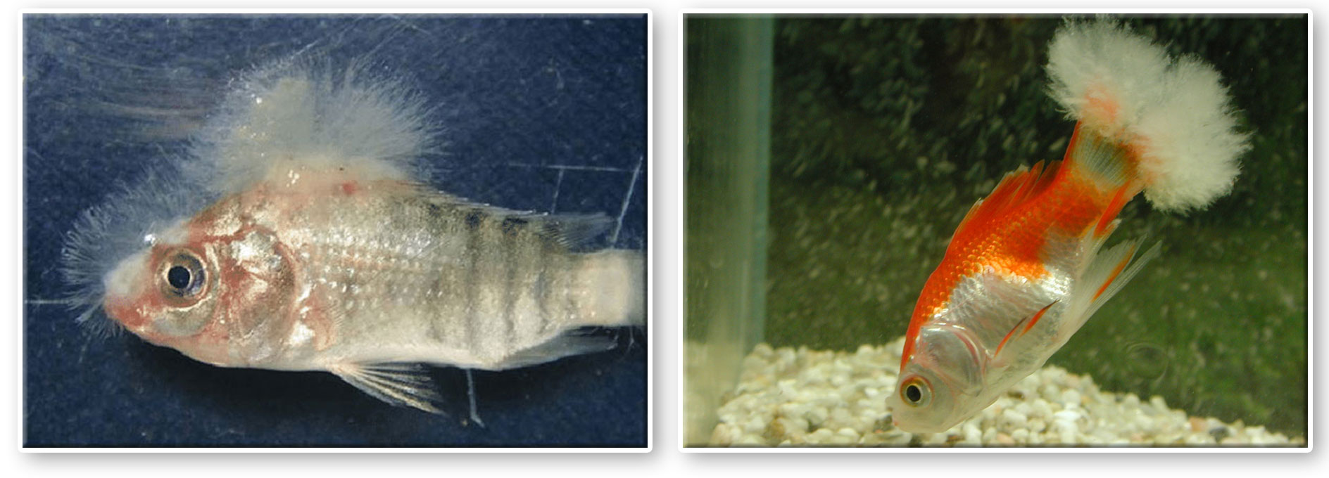 - Đầu tiên trên da cá xuất hiện các vùng trắng xám, sau vài ngày tại đó mọc lên các sợi nấm mảnh và phát triển lên thành từng búi nấm trắng như bông, 1 đầu sợi nấm bám vào da của cá, đầu kia tự do ngoài môi trường nước.