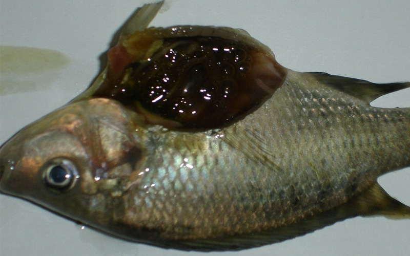 - Dấu hiệu: Cá bơi lờ đờ, tập trung gần bờ hoặc khu vực cấp nước. Xuất hiện các vết loét, đỏ trên thân, hậu môn đỏ. Nội tạng có dịch, gan thận xuất huyết.