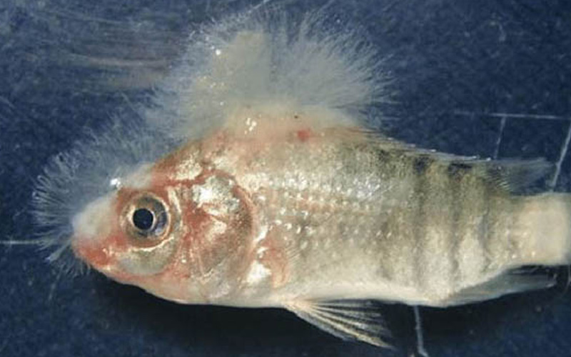 - Dấu hiệu: Trên thân, vây, mang xuất hiện từng mảng bông trắng như bông gòn. Cá bơi yếu, kém ăn, dễ chết rải rác.