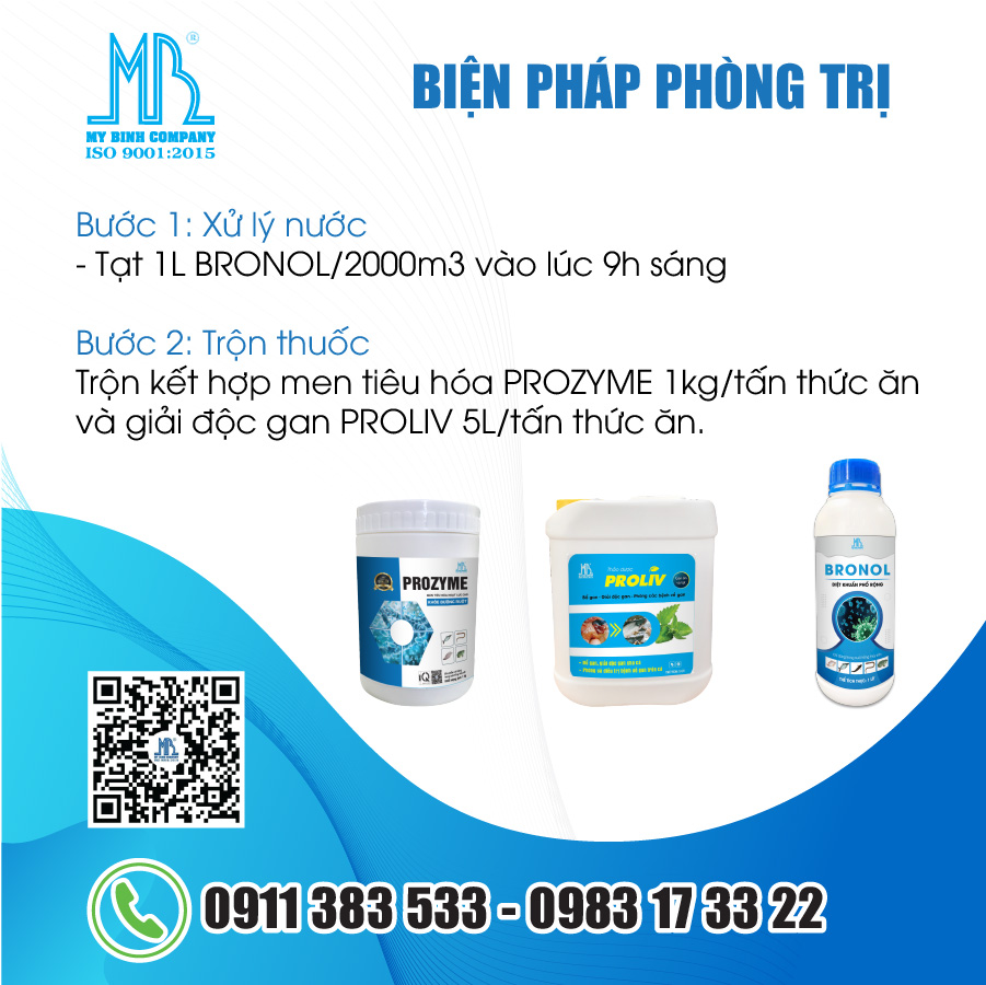 - Trộn kết hợp men tiêu hóa PROZYME 1kg/tấn thức ăn và giải độc gan PROLIV 5L/tấn thức ăn để hỗ trợ cá bệnh.