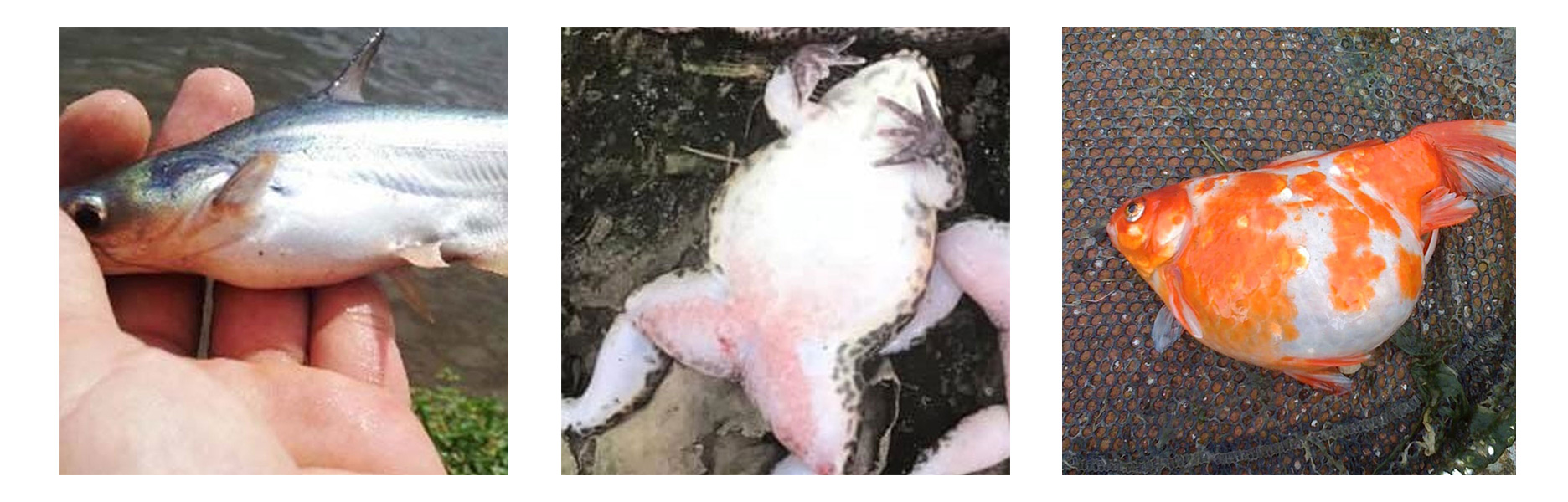 - Khi bệnh cá,ếch, lươn bỏ ăn, tập trung ở mé, gốc ao, cá yếu dần và chết.