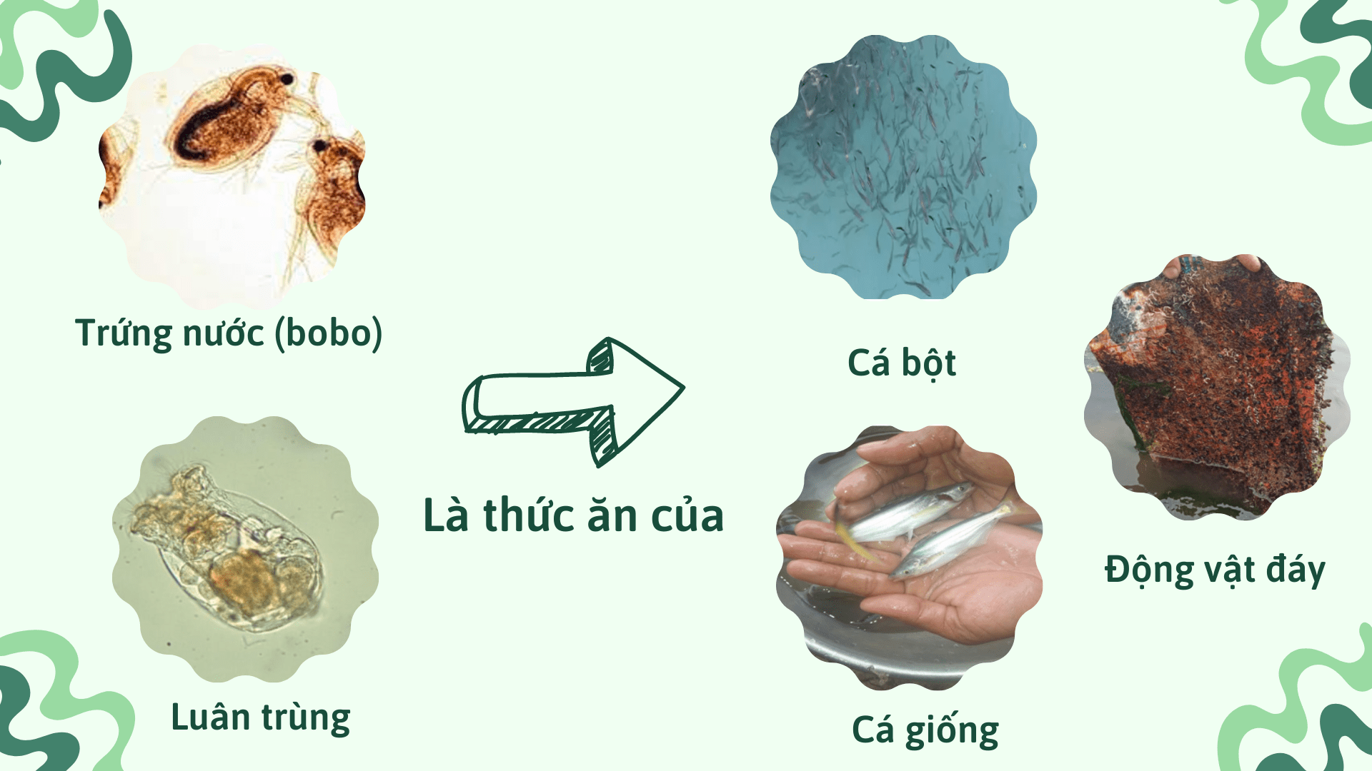 Sau khi trứng nước (bobo), luân trùng phát triển và sinh sản nhiều thì chúng sẽ trở thành nguồn dinh dưỡng, thức ăn cho cá bột và cá giống. Ngoài ra, các nhóm động vật đáy hoặc động vật thân mềm (ốc gạo, giun đốt, trùn chỉ, các loài hai mảnh vỏ,..) cũng sử dụng nguồn dinh dưỡng này để phát triển và tăng sinh.