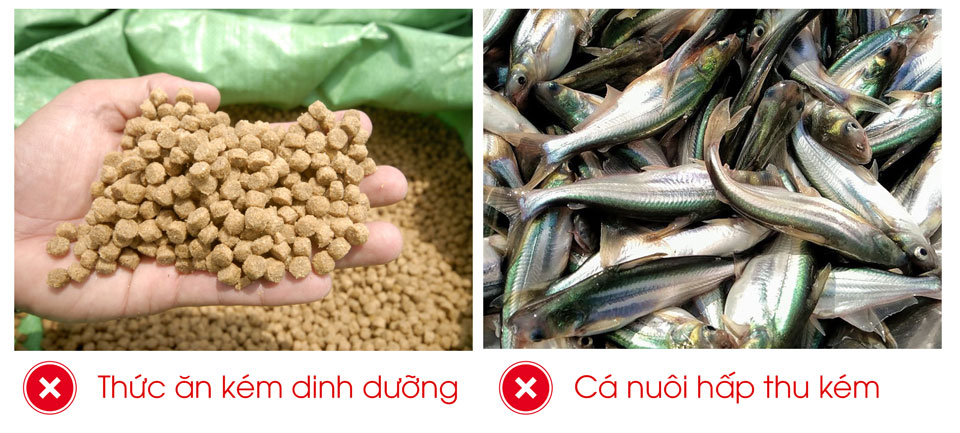 - Thức ăn hấp thu kém: Chất lượng thức ăn không tốt, cá tiêu hóa kém, tăng trọng chậm.