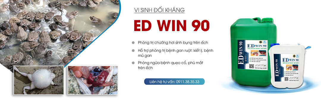- Trộn vào thức ăn: 20 ml ED WIN 90/1 kg thức ăn, cho ếch ăn đều các cữ trong ngày.