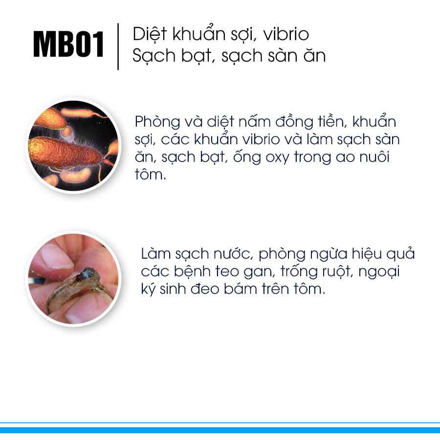 - Diệt khuẩn - nấm an toàn MB01: là dòng diệt khuẩn, nấm và ký sinh trùng an toàn không gây hại cho tôm kể cả tôm giống. Diệt khuẩn - nấm MB01 giúp làm sạch môi trường nước ao nuôi, ngăn ngừa sự phát triển của các mầm bệnh như nấm nói chung, nấm đồng tiền và vi khuẩn gây bệnh TPD trên tôm nuôi.