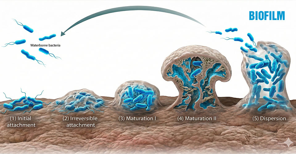 Tại đây, chúng tiết ra chất nhầy (EPS) liên kết với nhau tạo thành một lớp màng sinh học (Biofilm) phủ kín bề mặt vật liệu.