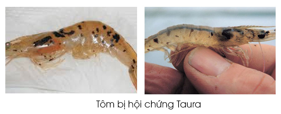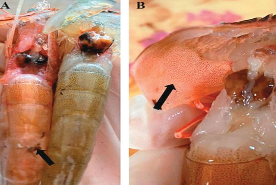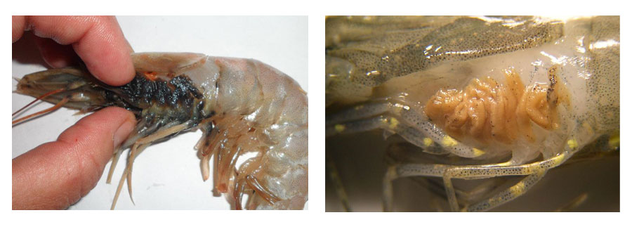 Vệt hoại tử đen: Kèm với các dấu hiệu khác như: phồng bóng nước ở vẩy râu và chân đuôi, phụ bộ bị hoại tử (thông thường phần cuối của phụ bộ có màu đen), hội chứng Taura hoặc bị tổn thương cơ học.