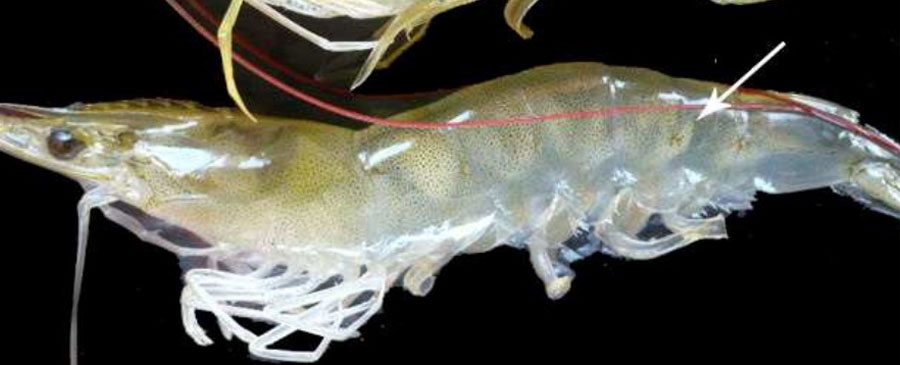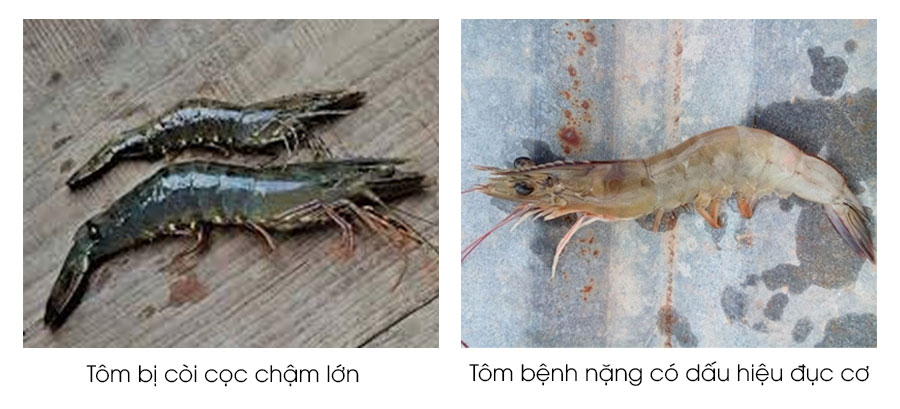 Những con tôm còi hay chậm lớn thường thấy một vết đỏ nâu hoặc trắng dọc lưng do sự tập trung sắc tố màu nâu vàng. Tôm ủ bệnh thường có vỏ cứng và tối màu