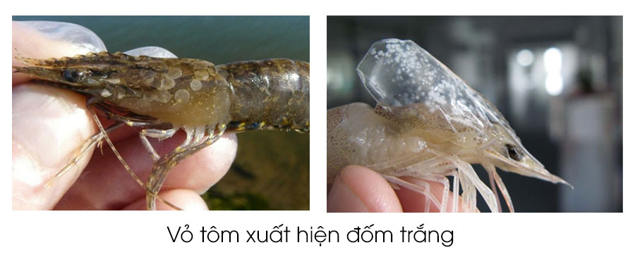 Sự xuất hiện những đốm trắng trên vỏ thường là do tôm bị nhiễm virus đốm trắng. Tuy nhiên những đốm trắng trên vỏ tôm cũng có thể do những nguyên nhân có liên quan đến pH hay ảnh hưởng của hàm hượng canxi có trong nước. Muốn xác định chính xác nguyên nhân gây ra những đốm trắng trên vỏ tôm. Thì cần phải tiến hành các bước kiểm tra, chuẩn đoán trong phòng thí nghiệm (PCR, mô bệnh học...)