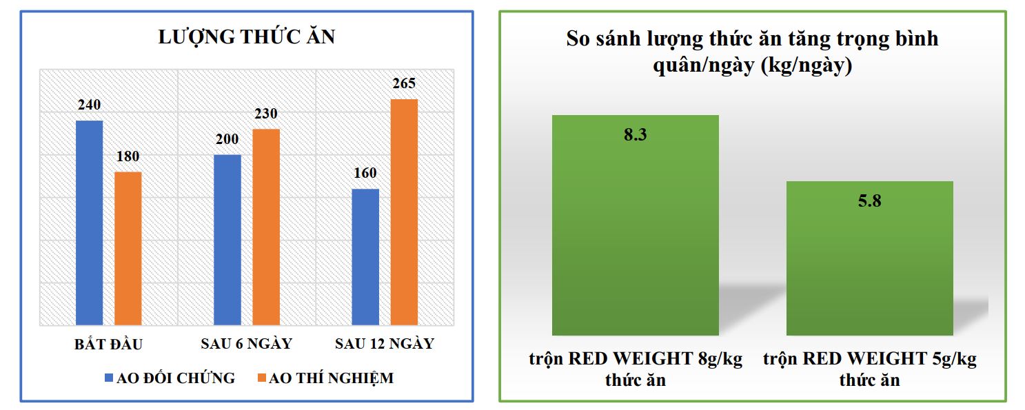So sánh lượng thức ăn giữa ao đối chứng (thức ăn không bổ sung RED WEIGHT) và ao thí nghiệm (thức ăn bổ sung RED WEIGHT)