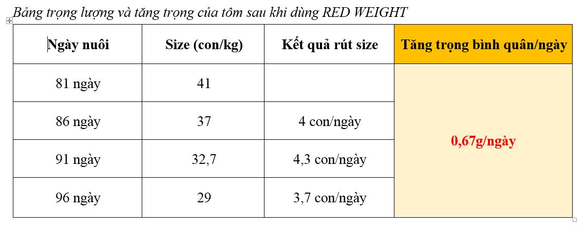 Dùng liên tục RED WEIGHT sau 12 ngày: tôm thẻ nhanh lớn, ăn mạnh,chắc thịt, cứng vỏ, màu sắc bóng đẹp: