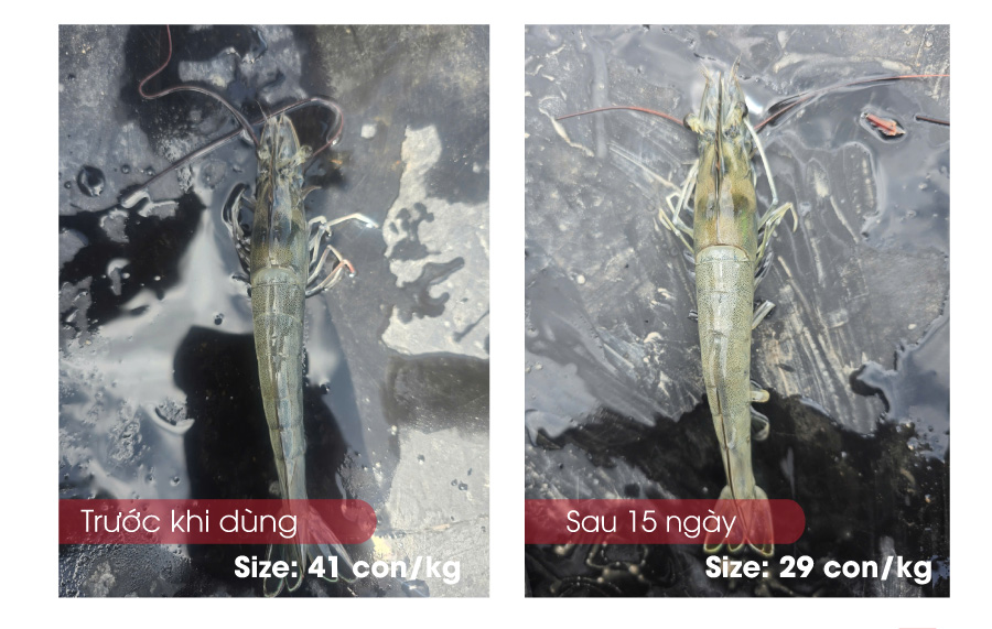 - Dùng lâu dài: Tôm khỏe mạnh, giảm bệnh gan ruột, tăng tỷ lệ sống và năng suất cuối vụ.