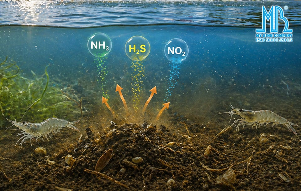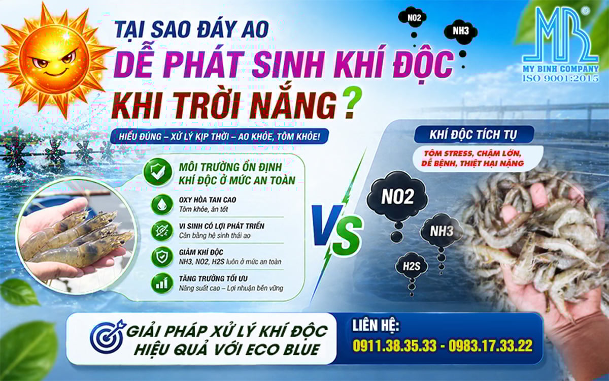 Trong nuôi tôm thâm canh, khí độc đáy ao là một trong những nguyên nhân hàng đầu làm tôm giảm ăn, chậm lớn, yếu sức và dễ bùng phát dịch bệnh. Đặc biệt vào thời điểm nắng nóng kéo dài, hiện tượng phát sinh khí độc như NH₃, H₂S, NO₂ ở đáy ao xảy ra nhanh và nghiêm trọng hơn.