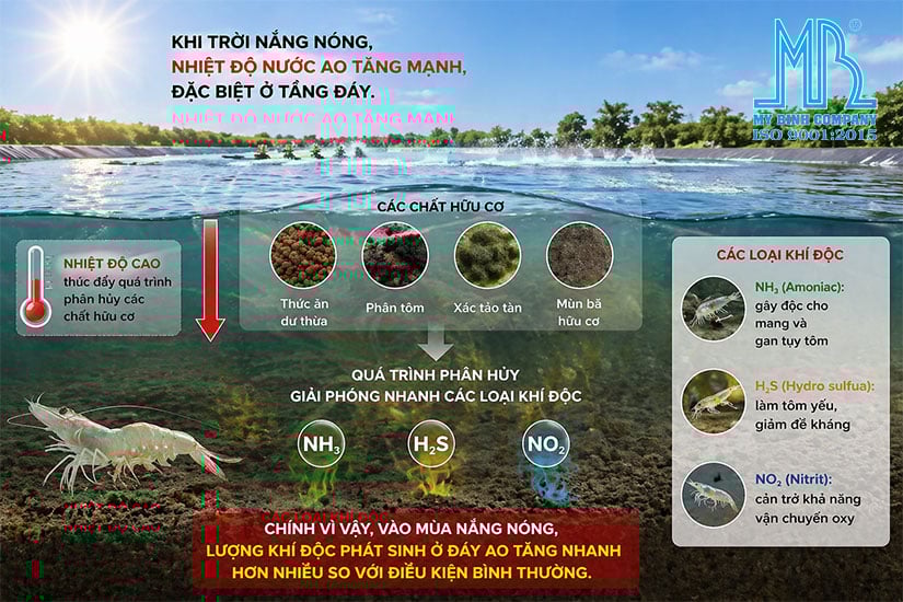 Khi trời nắng nóng, nhiệt độ nước ao tăng mạnh, đặc biệt ở tầng đáy. Nhiệt độ cao thúc đẩy quá trình phân hủy các chất hữu cơ như: