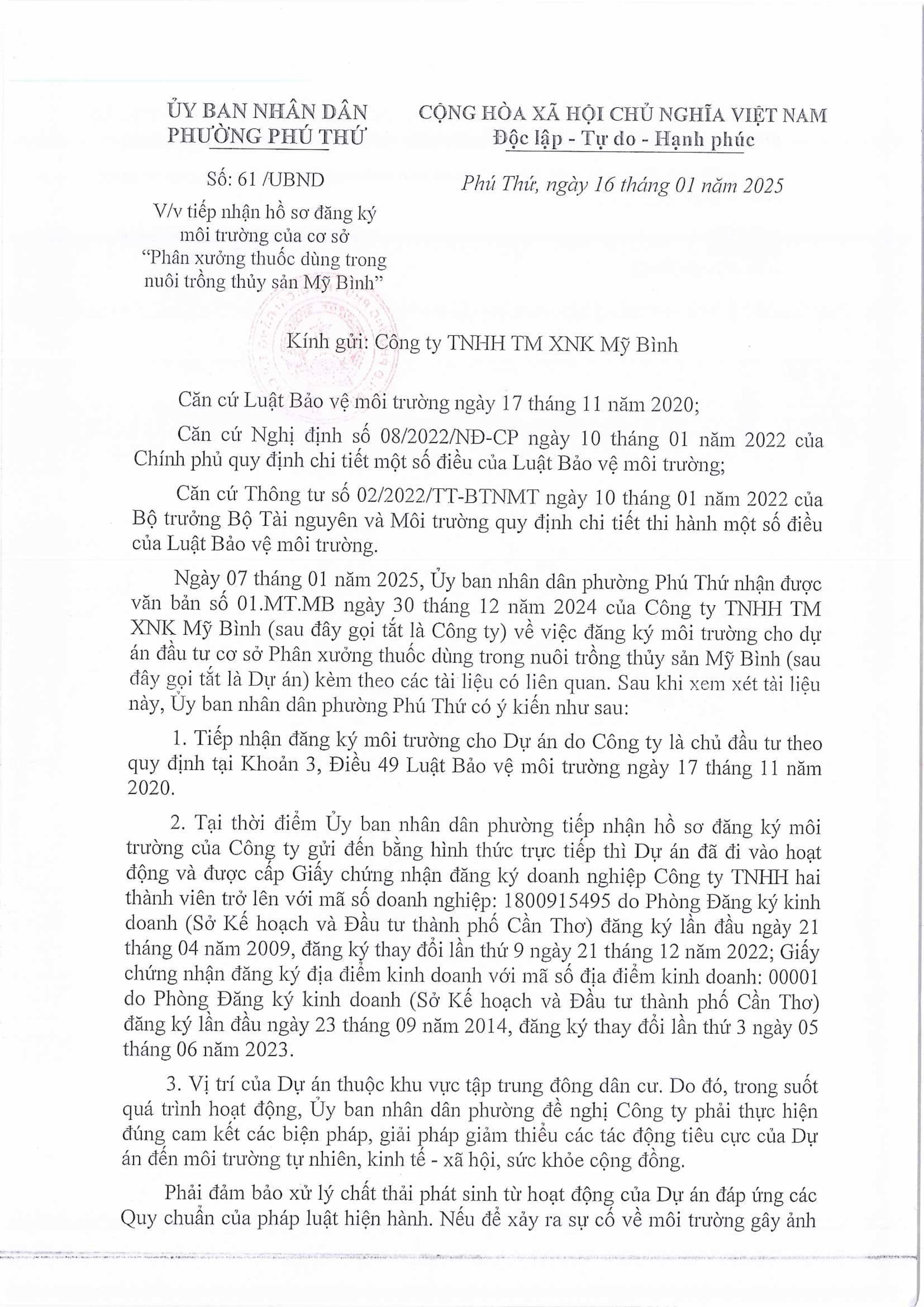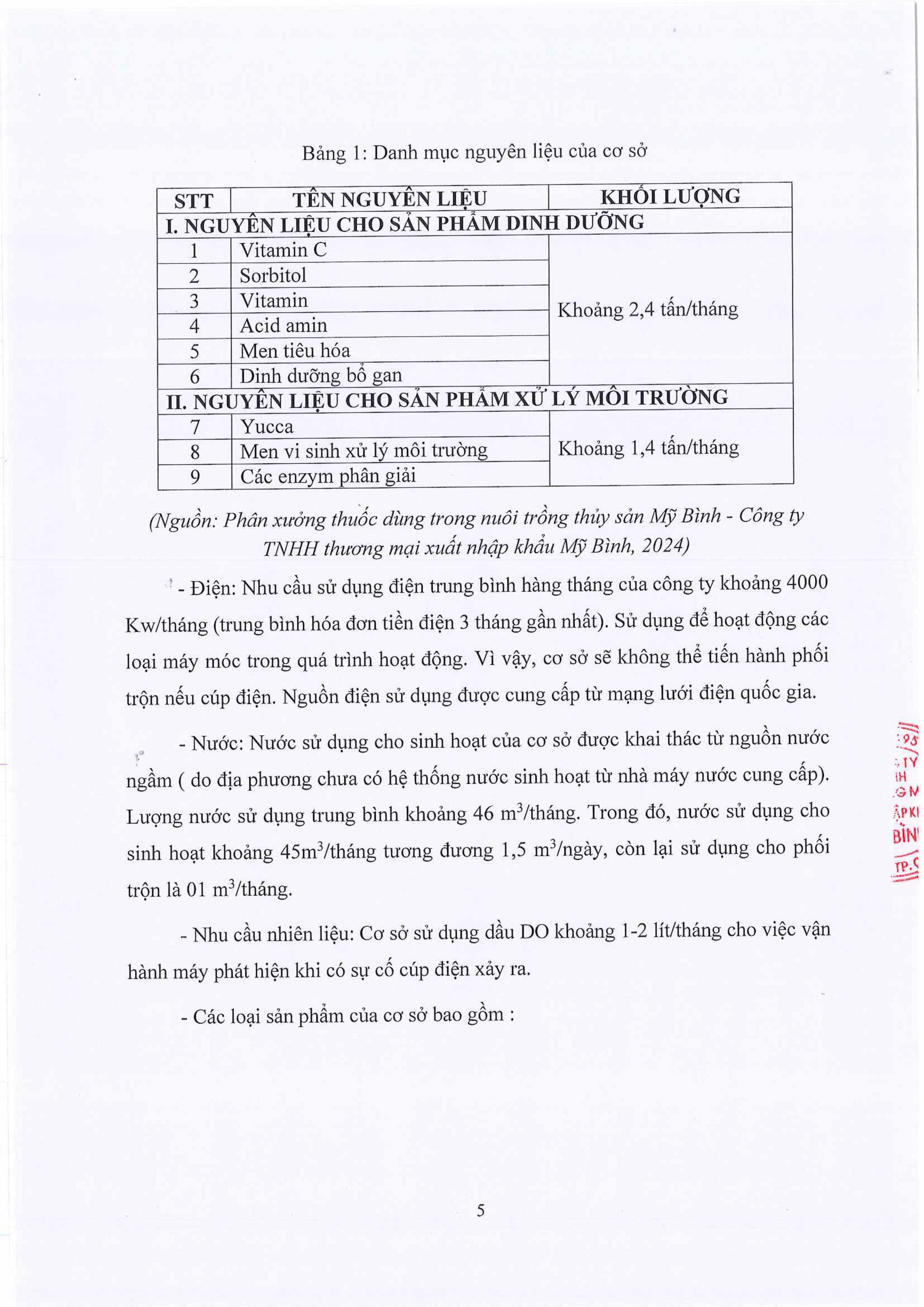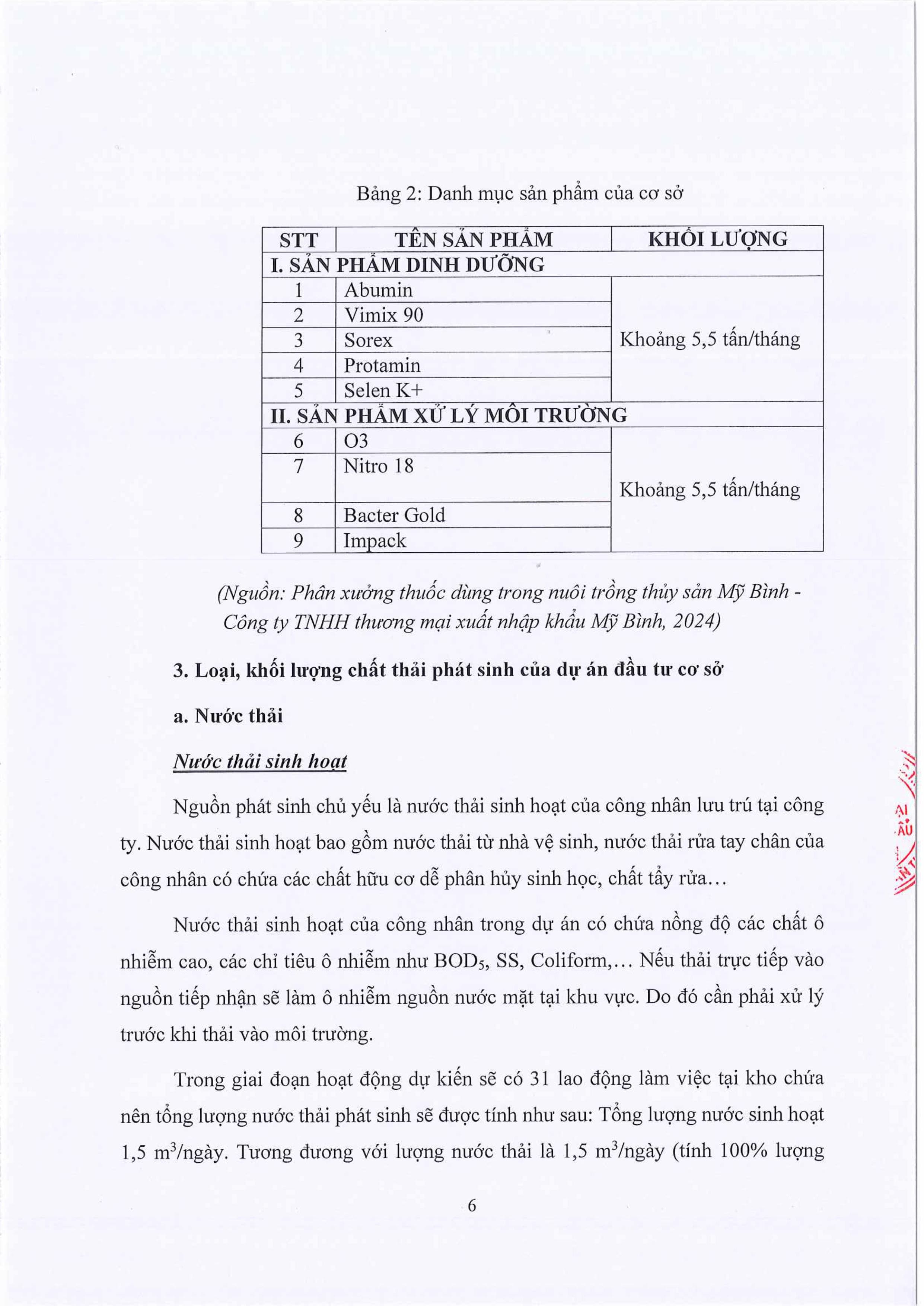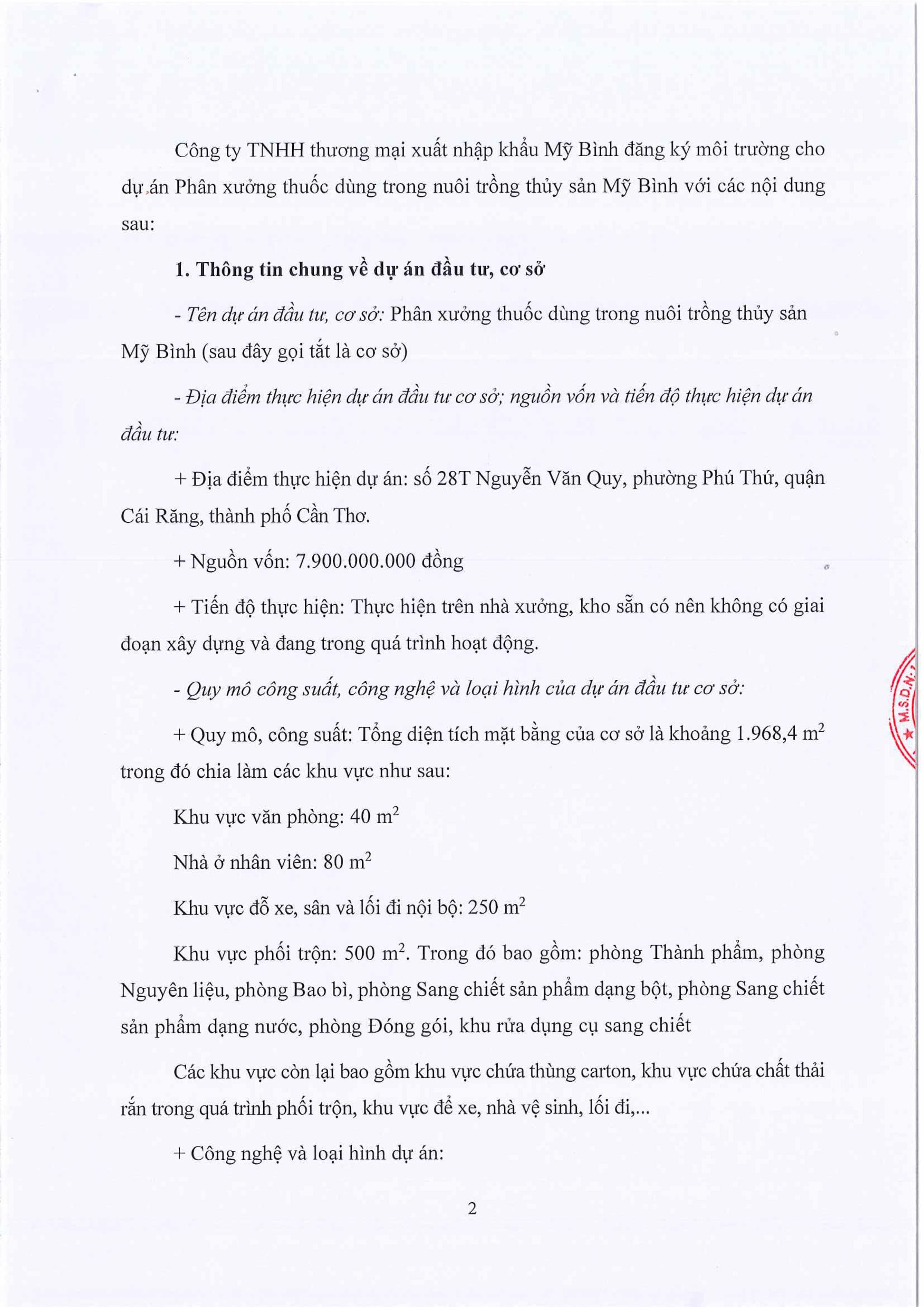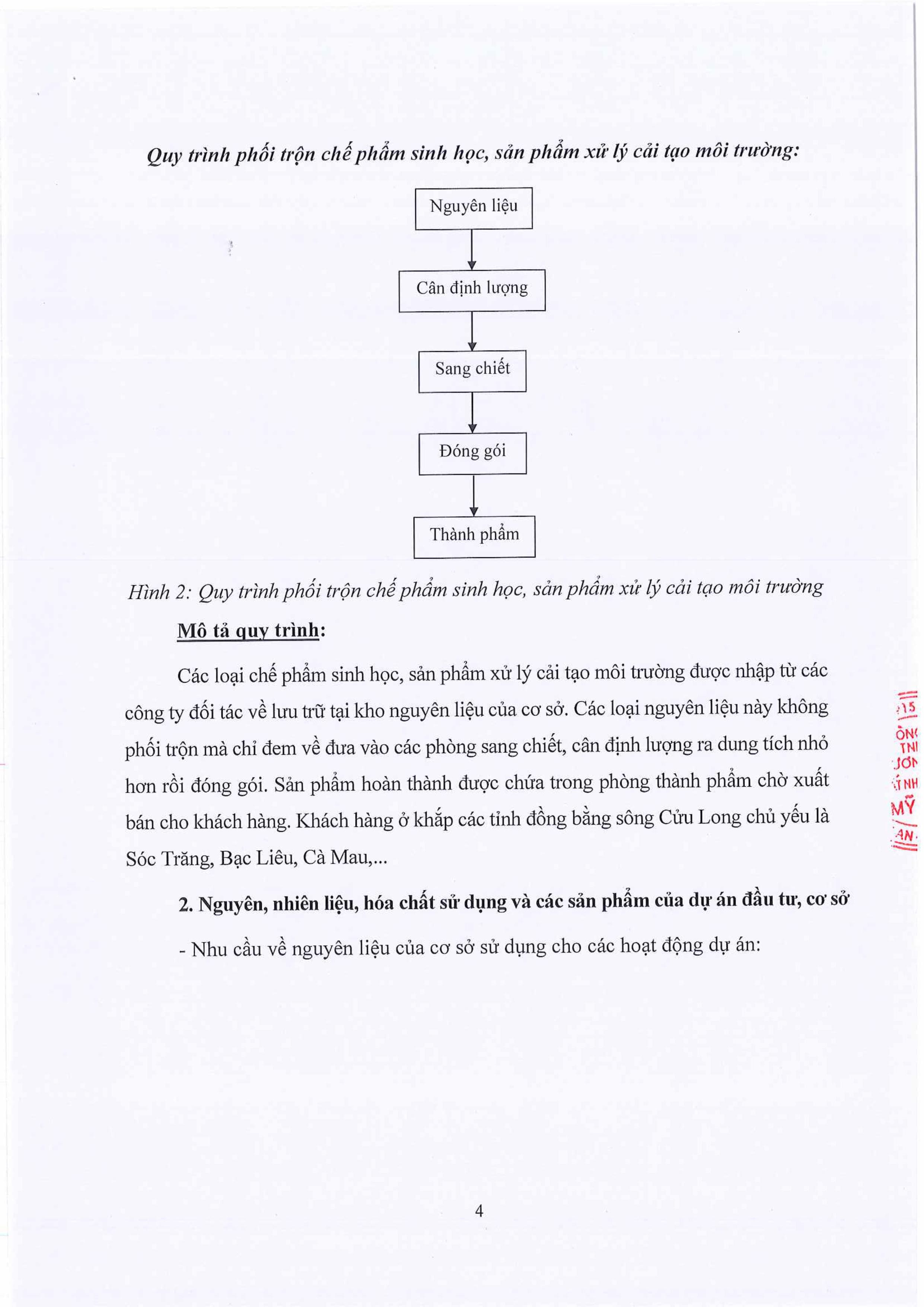Bản cam kết bảo vệ môi trường của dự án cơ sở sản xuất thuốc dùng trong nuôi trồng thủy sản Mỹ Bình