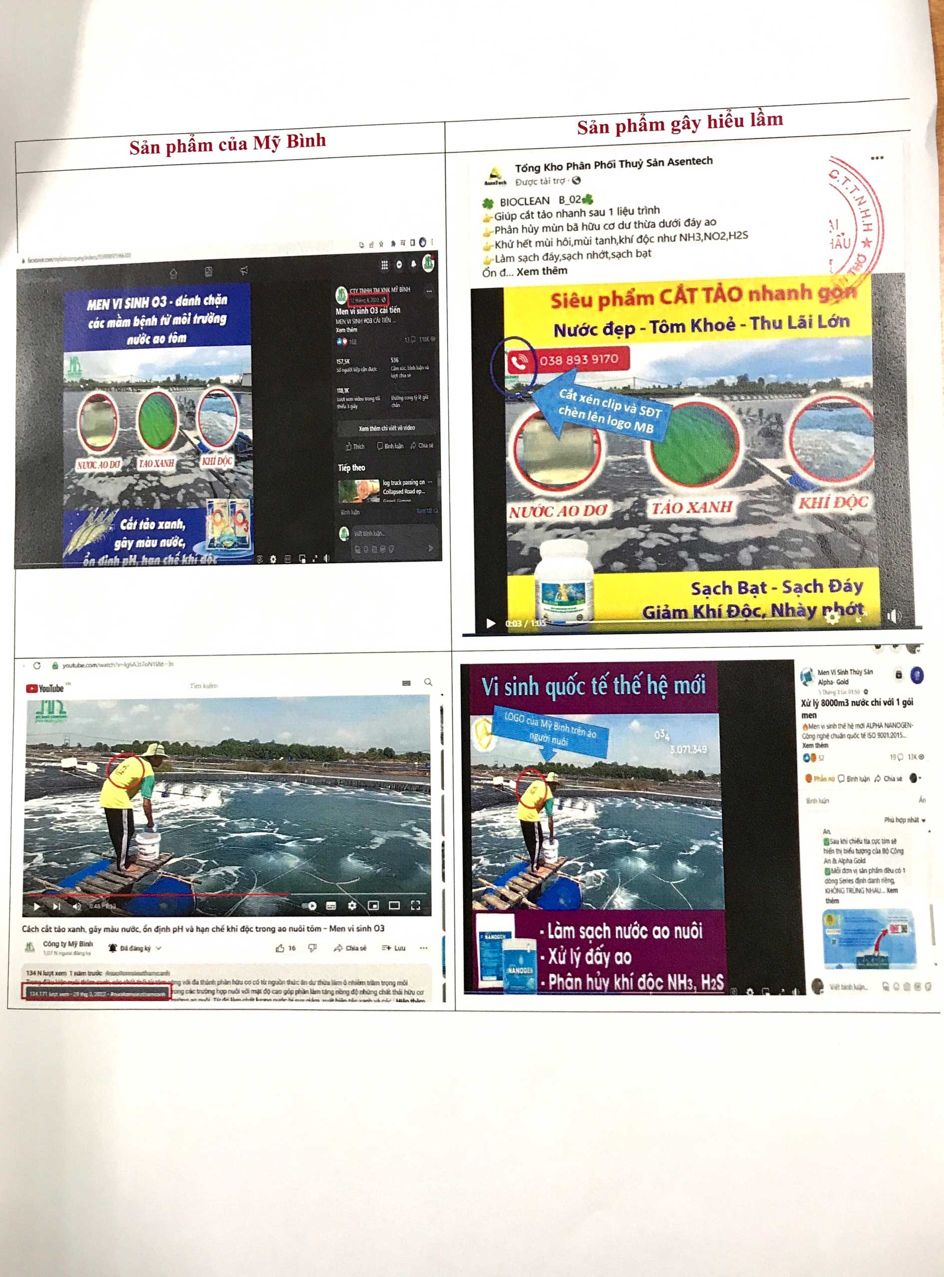 Cả hai bài viết này đã đánh cắp nội dung video về men vi sinh O3 - thành quả mà công ty Mỹ Bình đã dày công nghiên cứu và chứng minh về hiệu quả sử dụng: “Cách cắt tảo xanh, gây màu nước, ổn định pH và hạn chế khí độc trong ao nuôi tôm - Men vi sinh O3” đăng trên kênh youtube của Công ty Mỹ Bình vào ngày 29/03/2022 và bản quyền bài viết “Men vi sinh O3 cải tiến” trên fanpage Công ty TNHH TM XNK Mỹ Bình được đăng vào 16:12 ngày 12/4/2022.