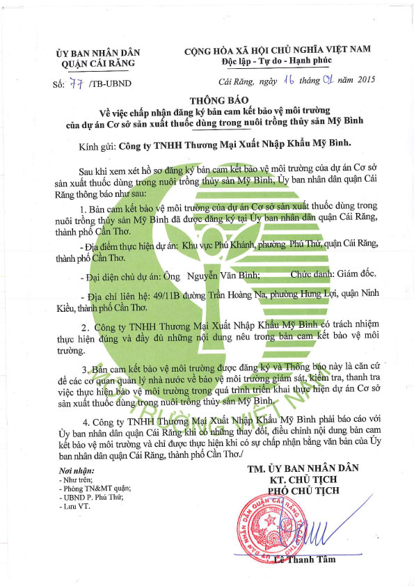 Thông báo: Về việc chấp nhận đăng ký bản cam kết bảo vệ môi trường của dự án Cơ sở sản xuất thuốc dùng trong nuôi trồng thủy sản Mỹ Bình.